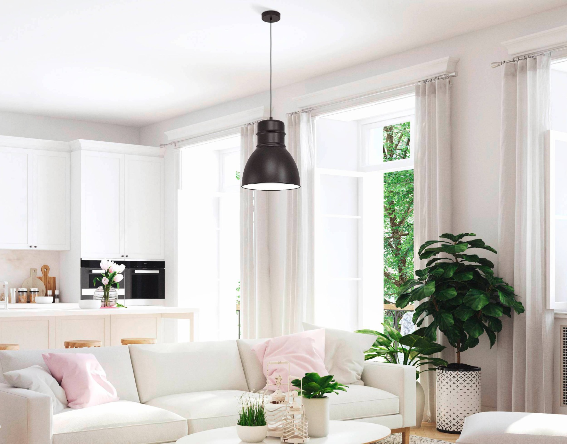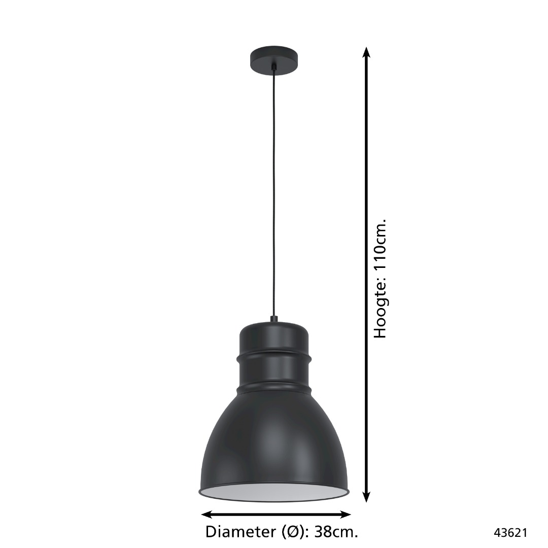 Een hanglamp uit de hanglampen collectie van het merk Eglo. De lamp is gemaakt van staal en heeft een zwarte kleur met een witte binnenkant. De lamp wordt geleverd exclusief lichtbron geschikt voor max. 60W. Deze lamp kan goed geplaatst worden in de woonkamer of eetkamer boven de eettafel bijvoorbeeld. De lamp heeft een simplistische elegante uitstraling en kan daardoor goed toegepast worden in modern interieur maar ook industrieël.