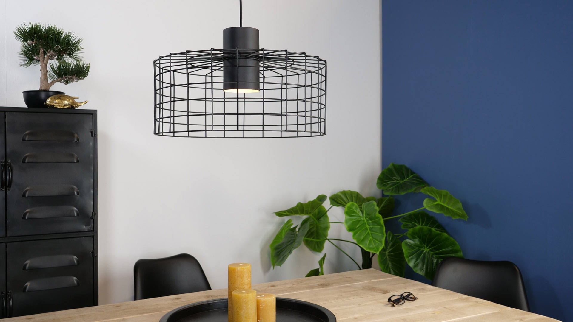 Een mooie hanglamp uit de hanglampen collectie van Eglo. De lamp heeft een moderne/ industriële look door het kooi achtige motief gemaakt van staal in de kleur zwart. De lamp wordt exclusief lichtbron geleverd en heeft een E27 fitting geschikt voor max. 40W. Deze lamp staat goed in de eetkamer, bijvoorbeeld boven de eettafel, maar kan ook zeker ergens anders in de woonkamer geplaatst worden.