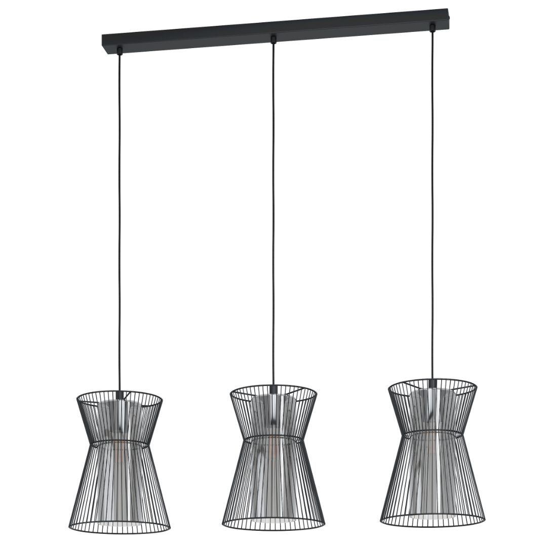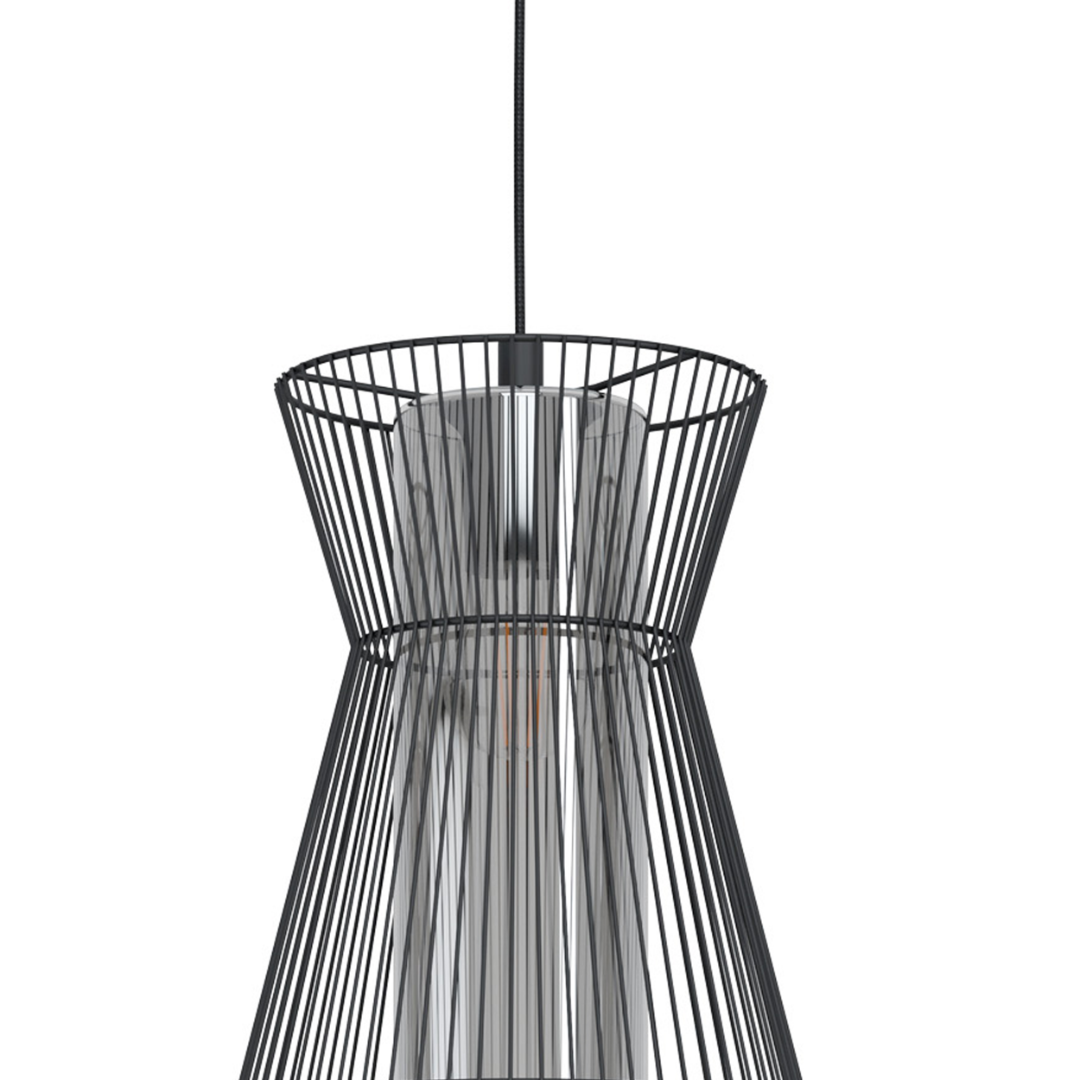 Een retro look hanglamp uit de lighting collectie van Eglo. De lamp is gemaakt van staal en gerookt glas en heeft een zwarte kleur met een zwart-transparant glas. De lamp heeft E27-fittineng en wordt exclusief lichtbronnen geleverd. Het is geschikt voor een max. wattage van 3x 40W. De lamp heeft een bijzondere vorm, waardoor het een mooie, unieke uitstraling geeft aan je huis. De lamp is een goed voorbeeld van een lamp die mooi boven de eettafel kan worden opgehangen.