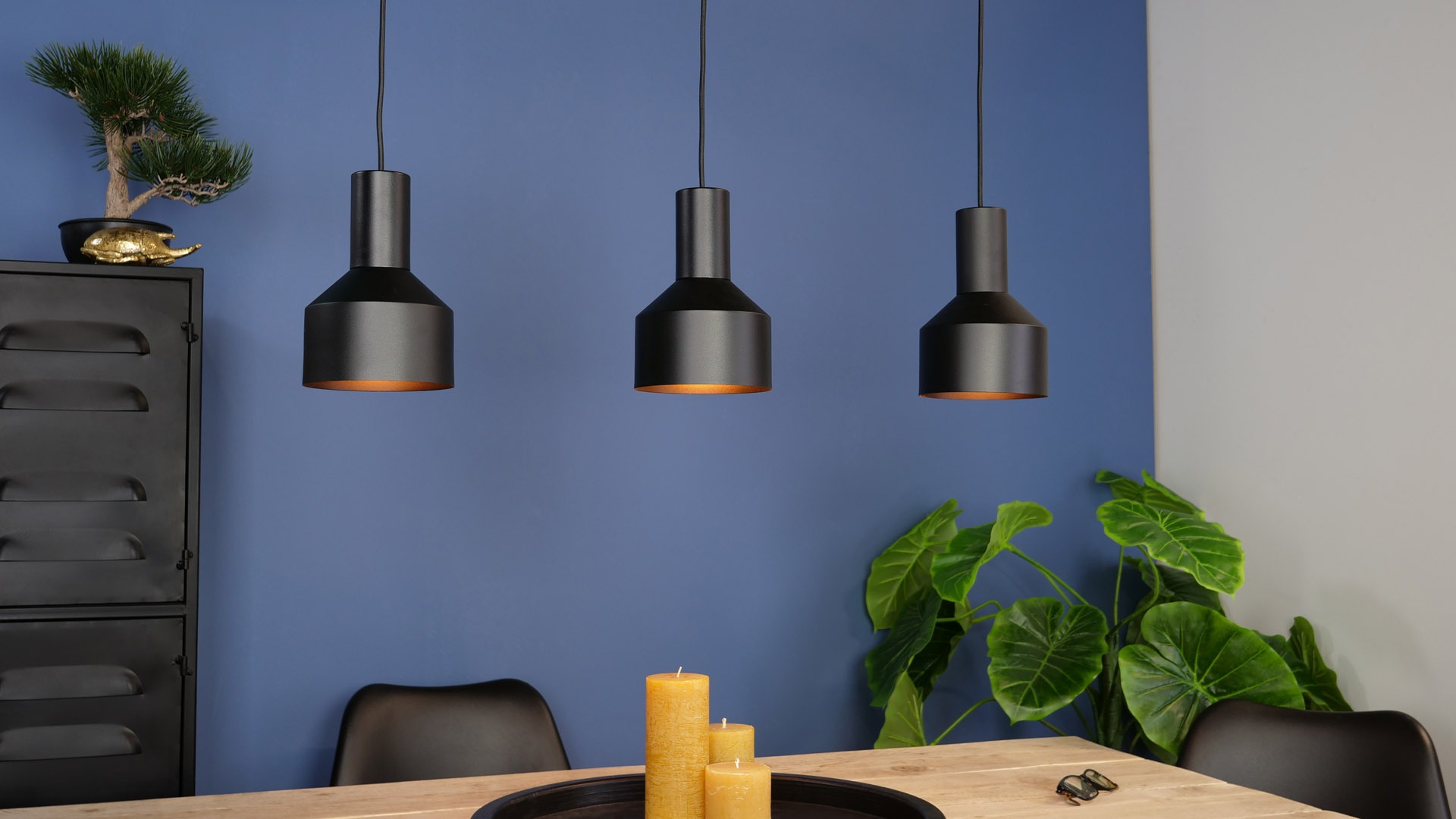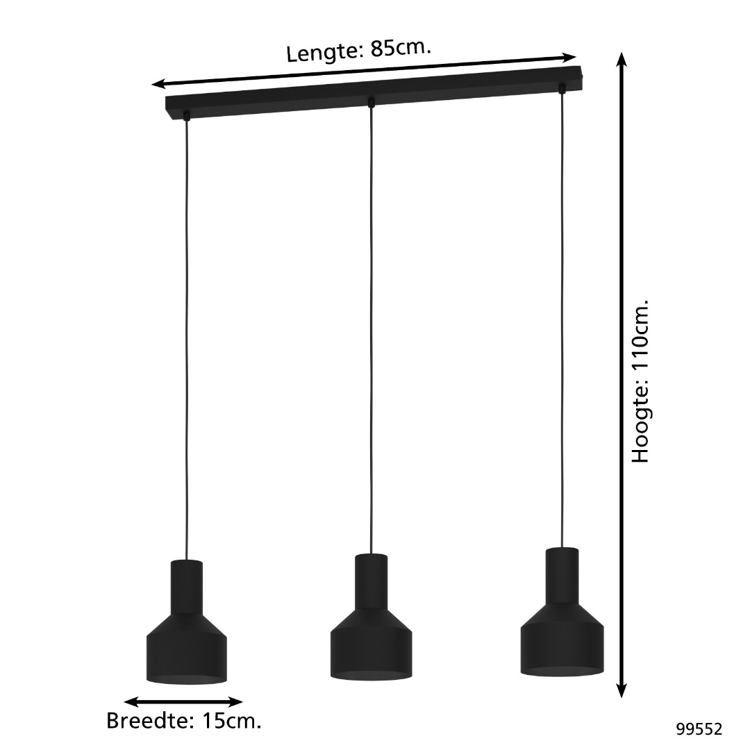 Een moderne hanglamp uit de lighting collectie van Eglo. De lamp is gemaakt van staal en heeft een geheel zwarte kleur. De lamp heeft E27-fittingen en wordt exclusief lichtbronnen geleverd. Het is geschikt voor een max. wattage van 3x 40W. De lamp heeft een bijzondere vorm, waardoor het een mooie, unieke uitstraling geeft aan je huis. De lamp is een goed voorbeeld van een lamp die mooi boven de eettafel kan worden opgehangen.