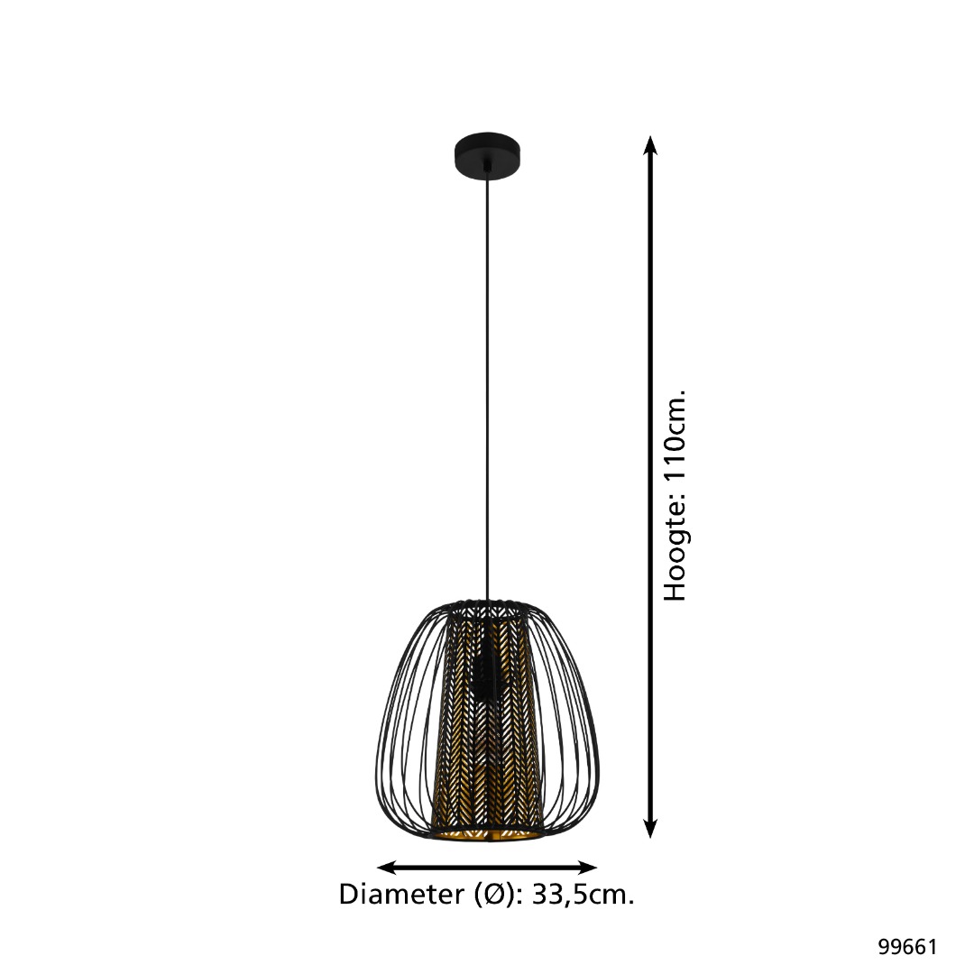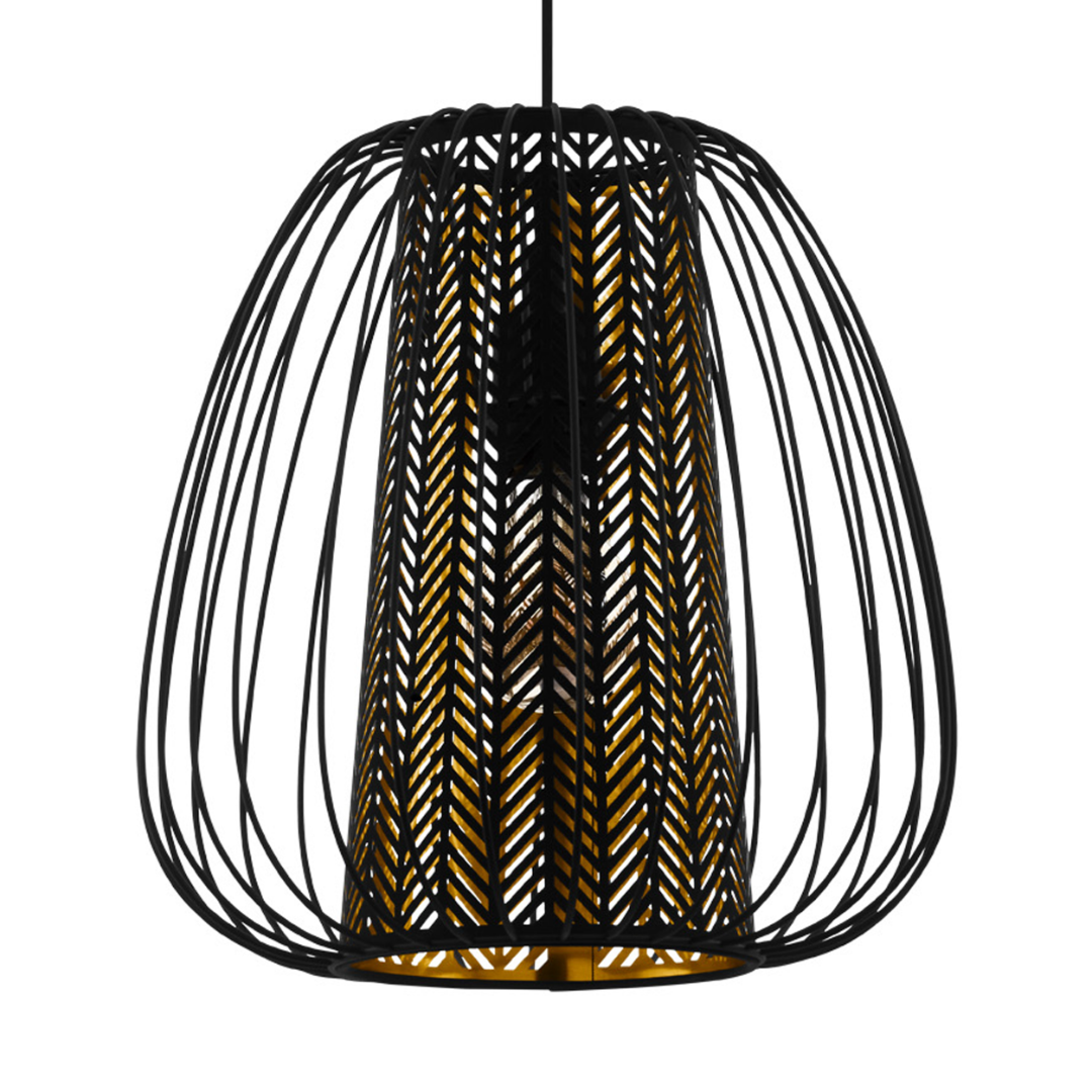 Een moderne hanglamp uit de hanglampen collectie van Eglo. De lamp is gemaakt van staal en textiel heeft een zwarte kleur met een gouden accent. De lamp heeft een E27-fitting en wordt exclusief lichtbron geleverd. Het is geschikt voor een max. wattage van 40W. De lamp heeft een bijzondere vorm, waardoor het een mooie, unieke uitstraling geeft aan je huis. De lamp is een goed voorbeeld van een lamp die mooi boven de eettafel kan worden opgehangen of in de woonkamer.