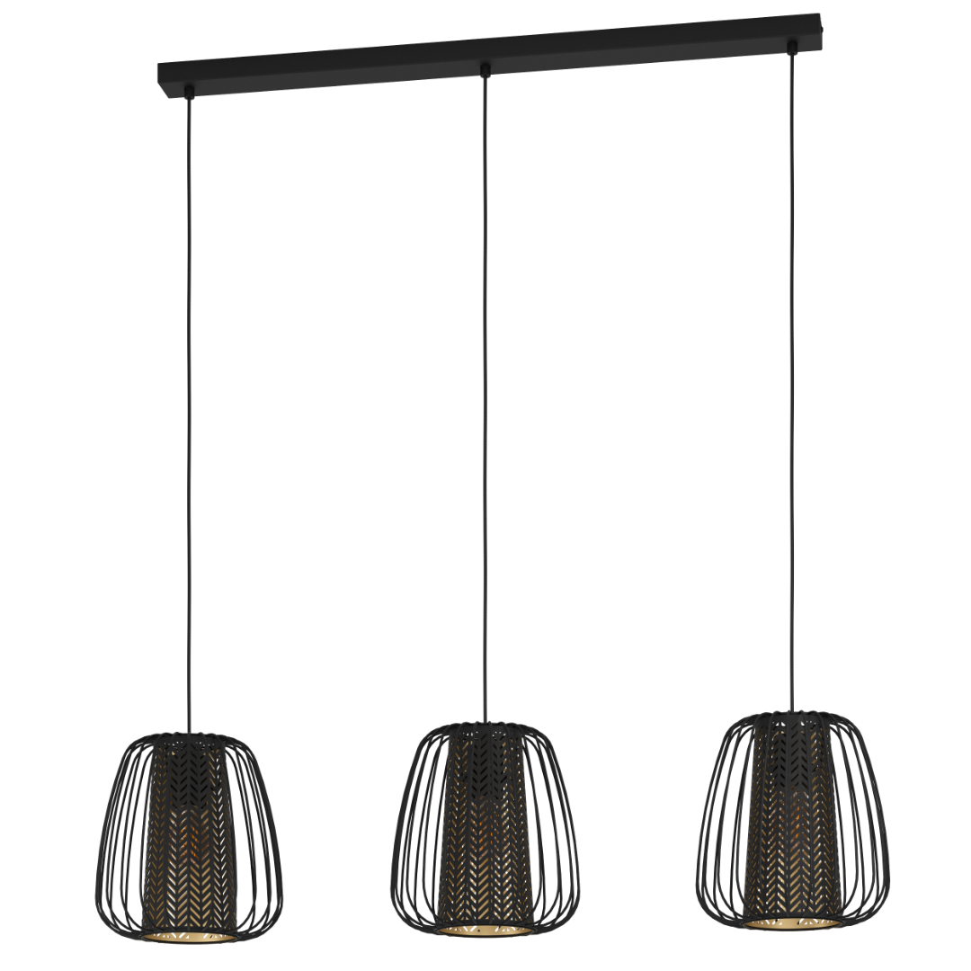 Een moderne hanglamp uit de hanglampen collectie van Eglo. De lamp is gemaakt van staal en textiel heeft een zwarte kleur met een gouden accent. De lamp heeft E27-fittingen en wordt exclusief lichtbronnen geleverd. Het is geschikt voor een max. wattage van 3x 40W. De lamp heeft een bijzondere vorm, waardoor het een mooie, unieke uitstraling geeft aan je huis. De lamp is een goed voorbeeld van een lamp die mooi boven de eettafel kan worden opgehangen of in de woonkamer.