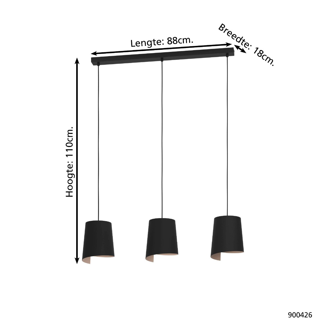 Een hanglamp uit de collectie van Eglo met een moderne uitstraling. De lamp is gemaakt van staal en heeft een chique compleet zwarte kleur. Deze lamp is een mooi voorbeeld van een lamp die je in de eetkamer kan hangen boven een eettafel. De lamp wordt exclusief lichtbronnen geleverd en is geschikt voor max. 3x 40W met E27-fittingen.