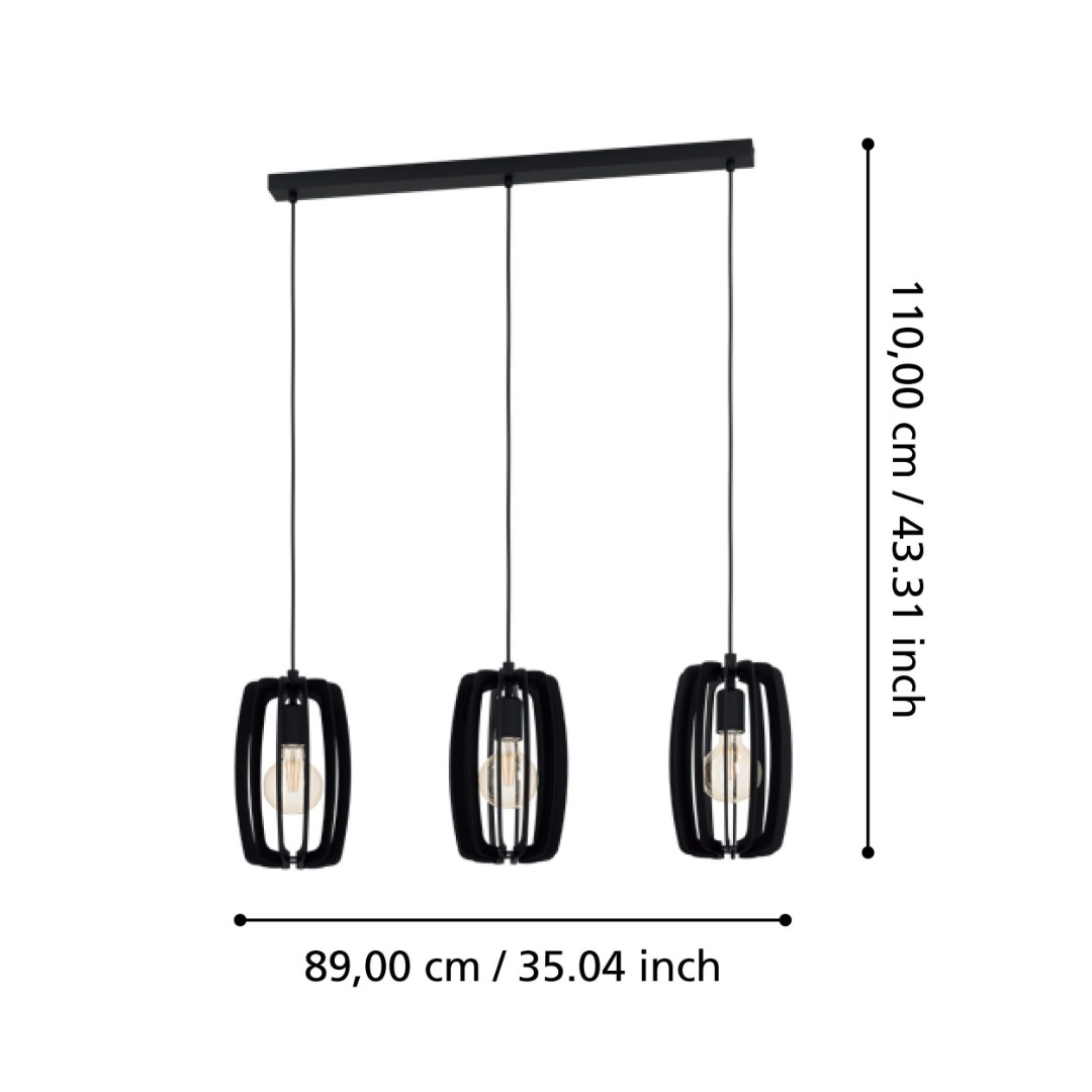 Een opvallende hanglamp uit de collectie van Eglo. De lamp heeft een moderne look gemaakt van staal en hout in een mooie zwarte kleur met zwarte behuizing en koord. De lamp zou ook kunnen worden toegepast in een meer landelijke omgeving. De lamp wordt exclusief lichtbronnen geleverd en is geschikt voor een wattage van max. 3x 40W met E27-fittingen. Deze lamp kan in de eetkamer goed tot zijn recht komen, bijvoorbeeld boven een eettafel.