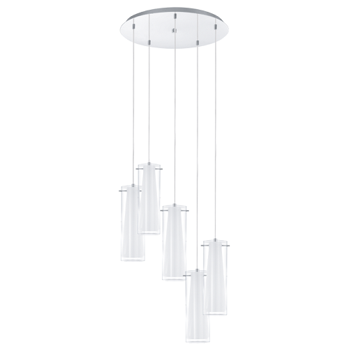 Een hanglamp uit Eglo´s hanglampen collectie. De lamp heeft een stalen behuizing in de kleur chroom. De kap van de Pinto is gemaakt van opaal-mat glas. De lamp heeft vijf E27-fittingen met een maximaal wattage van 60W en wordt zonder lichtbronnen geleverd. Deze lamp staat goed in de eetkamer, bijvoorbeeld boven de eettafel.