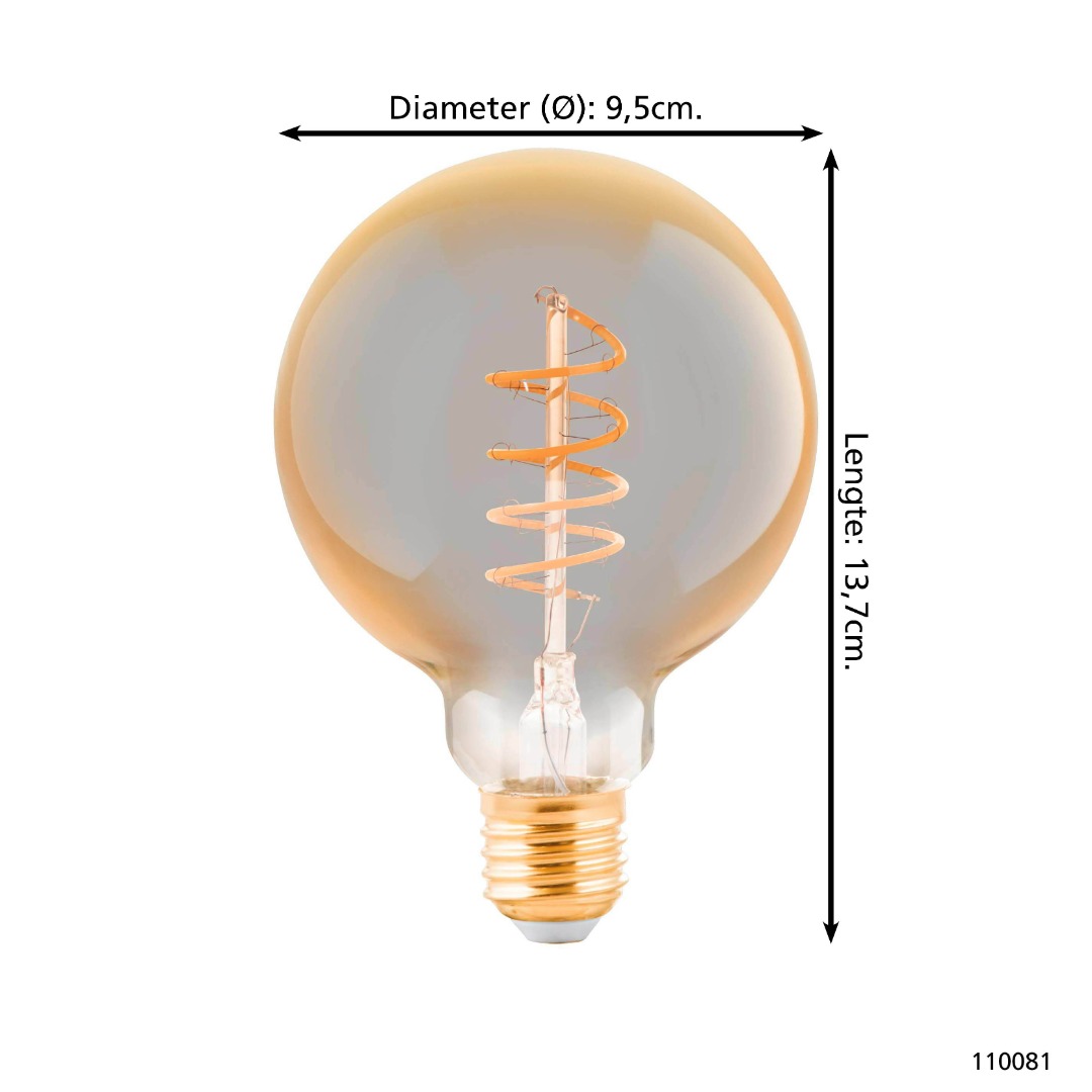 Een prachtige LED lamp van Eglo met een globe vorm die goed toepasbaar is in een armatuur met E27 fitting. De lamp heeft een lichte goud kleur en kan gedimd worden om de perfecte sfeer te creëren.