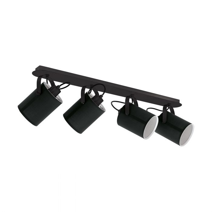 Een opbouwspot bestaande uit vier opbouwspots uit de collectie van Eglo. De lamp heeft een moderne simplistisch look en kan goed worden ingevoerd in verschillende soorten interieur. Het materiaal van deze lamp is staal en textiel en de kleur is zwart, de binnenkant van de kappen zijn wit. Deze lamp staat goed in de hal, woonkamer of slaapkamer. De lamp wordt exclusief lichtbron geleverd en is geschikt voor max. 4x 10W (LED).