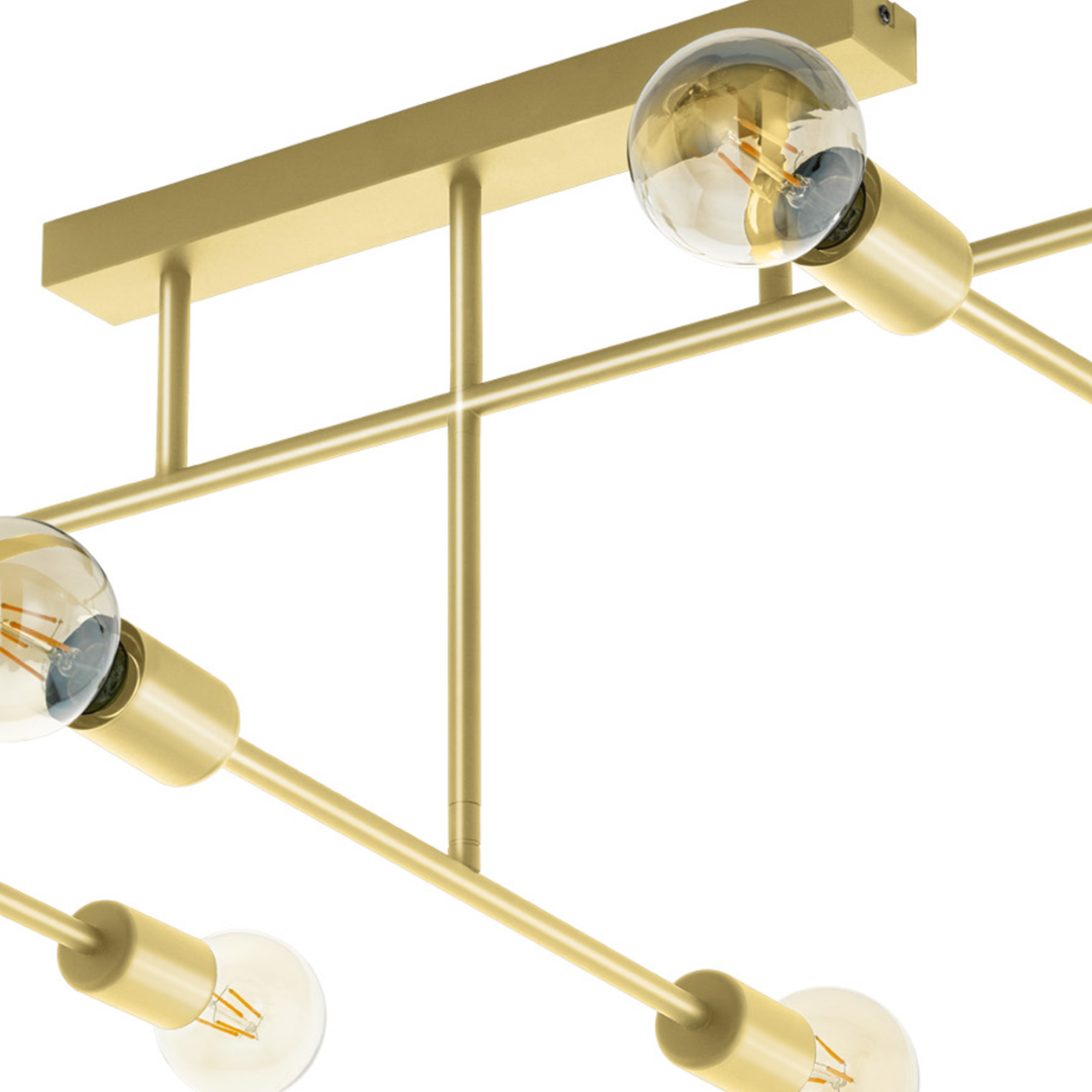 Een mooie plafondlamp uit de plafondlampen collectie van het merk Eglo. De lamp is gemaakt van staal en heeft een geelkoper- geborstelde kleur. De lamp wordt geleverd exclusief E27 lichtbronnen geschikt voor max. 8x 40W. Deze lamp kan goed geplaatst worden in de hal, woonkamer of slaapkamer. Door de unieke vorm en uitstraling is deze lamp een opvallende verschijning.