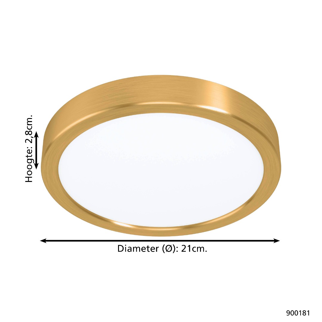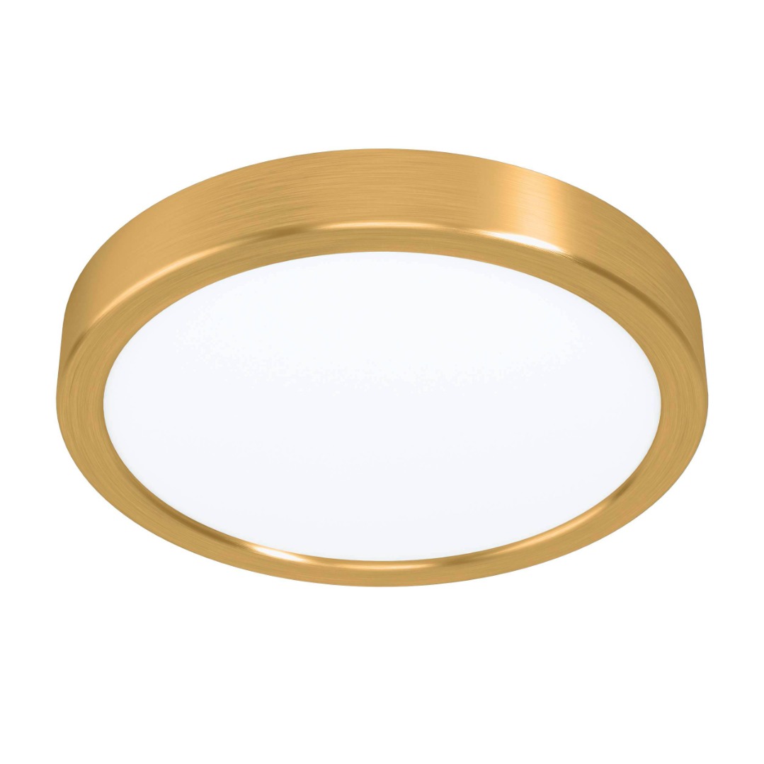Een stijvolle plafondlamp van het merk Eglo met een opvallende geelkoper-geborstelde kleur (goud-achtig). De lamp is gemaakt van staal en kunststof en de kap heeft de kleur wit. De lamp kan goed toegepast worden in verschillende ruimtes zoals hal, slaapkamer of woonkamer. Er zit een ingebouwde LED lichtbron in die een wattage heeft van 17W.