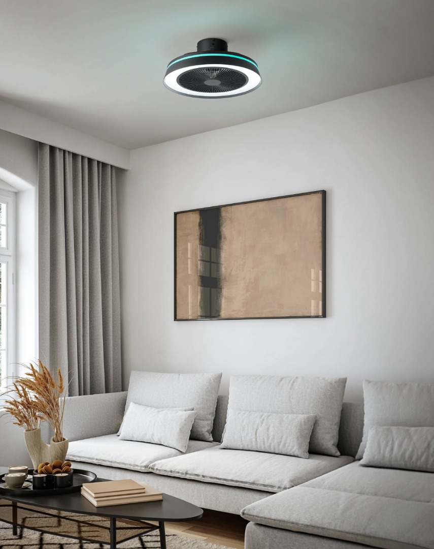 Ideaal voor de warme zomers, op kantoor, in de slaapkamer of gewoon in de woonkamer, maar ook in de winter kan je deze ventilator gebruiken doordat hij in de winterstand de warme lucht omlaag duwt. De ventilator is gemaakt van kunststof in een moderne zwarte kleur. De ventilator geeft zowel licht via de onderste ring (in wittinten instelbaar van 2700-6500K), maar heeft ook bovenin nog een ring zitten waar het licht uitkomt (in kleur instelbaar) en zijn afzonderlijk instelbaar. Het fijne aan deze ventilator is dat je met de meegeleverde afstandsbediening gebruik kan maken van de andere vele opties, zoals dimmen, nachtfunctie, 3 verschillende snelheden, maar ook tijdinstellingen dat de ventilator na verloop van tijd uitgaat.