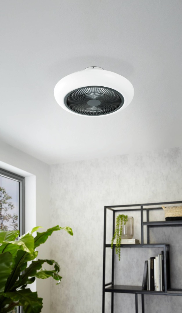 Een moderne plafondventilator zonder al te veel poespas. Het wit met zwarte design zorgt dat de ventilatorlamp bijna in elk interieur wel past. De lamp kan je instellen van warm tot koelwit (2700K-6500K) en is ook nog eens dimbaar. De ventilator is in te stellen in 3 snelheden en de plastic witten kap van de lamp heeft een gespikkeld patroon. Dit alles stel je in met de meegeleverde afstandsbediening.