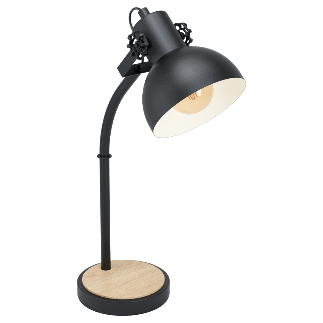 Een tafellamp uit de Vintage lampen collectie van Eglo. De lamp heeft een Vintage look en heeft de kleuren zwart en bruine accenten. Het materiaal van deze lamp is staal en hout. De lamp heeft een E27 fitting en is geschikt voor max. 1x 28W. Deze lamp staat goed in de woonkamer of slaapkamer als nachtlamp. De lamp is uitgerust met een handige snoerschakelaar en een snoerlengte van 150 cm.