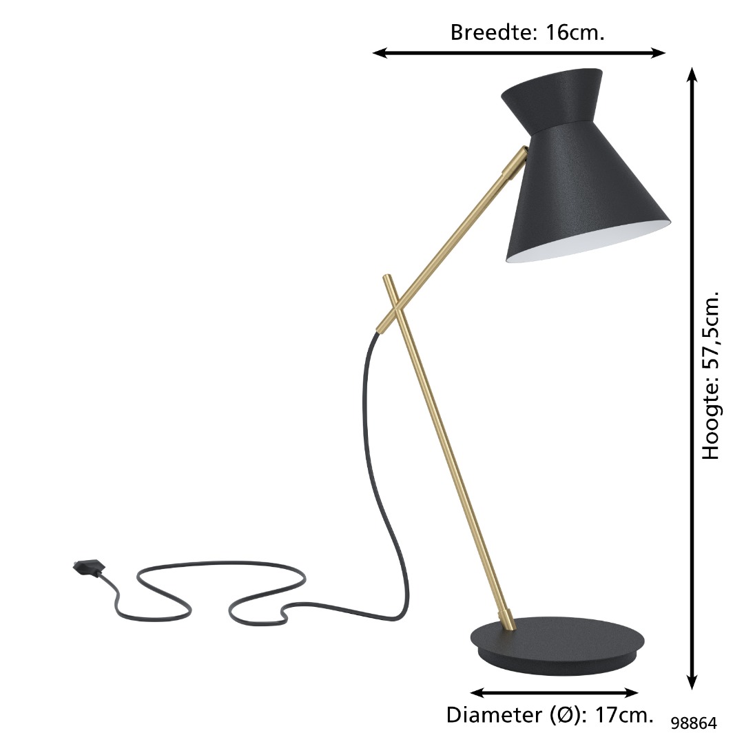 Een moderne tafellamp uit de tafellampen collectie van Eglo. Deze lamp is gemaakt van staal en heeft een zwarte kleur met geelkoperen arm. De tafellamp met E27-fitting wordt exclusief lichtbron geleverd en is geschikt voor een maximaal wattage van 10W. Deze lamp staat goed in verschillende soorten interieur door de simplistische look. Deze lamp is een ideale aanvulling voor verschillende ruimtes zoals uw woonkamer of slaapkamer, bijvoorbeeld op een nachtkastje. Deze lamp heeft een handige wipschakelaar.