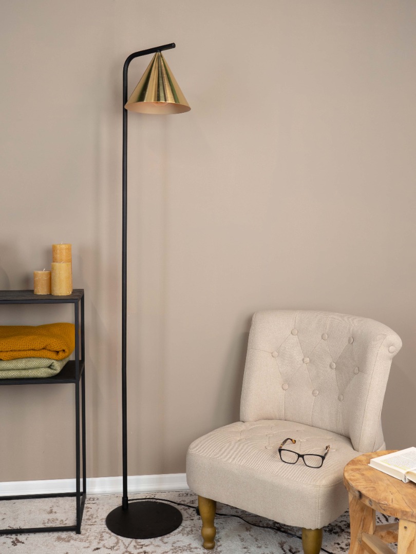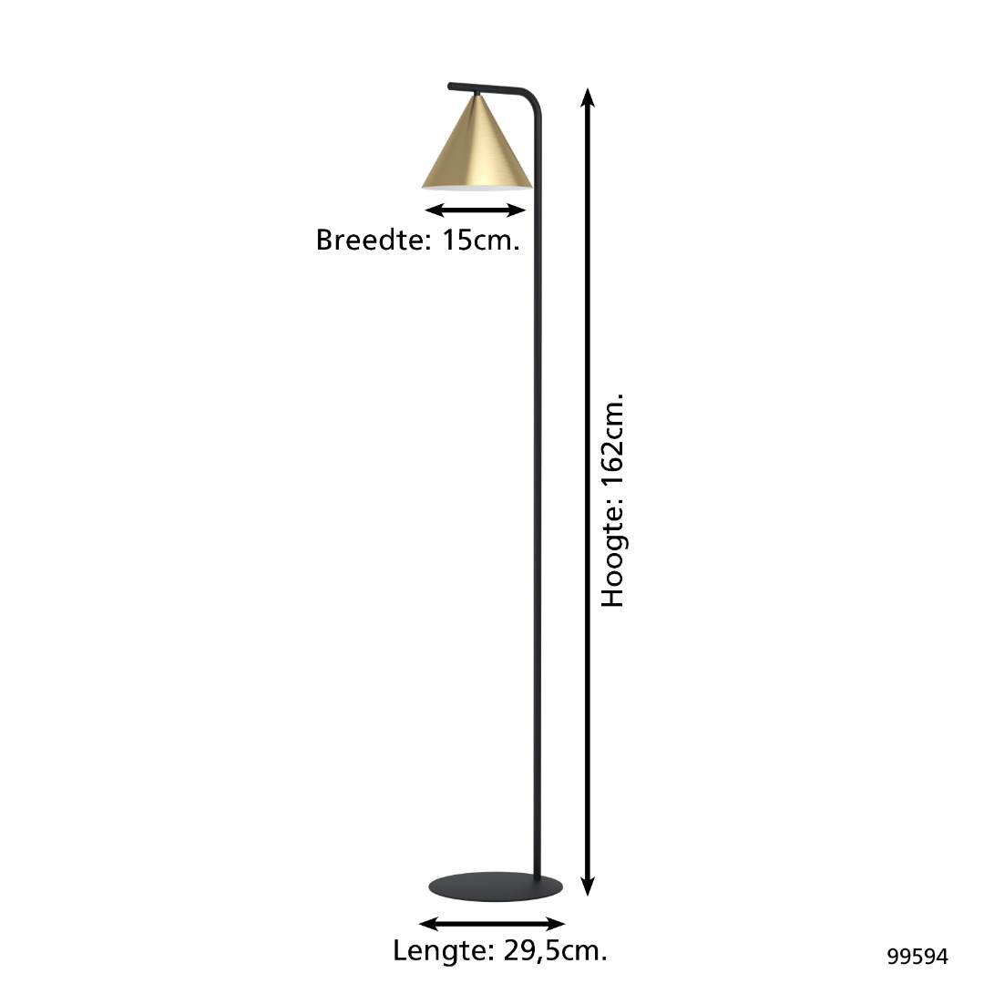 Een mooie vloerlamp uit de lighting collectie van Eglo. De lamp is gemaakt van staal en heeft een zwarte met geborsteld messing en gouden kleur. De lamp heeft een E27-fitting en wordt exclusief lichtbron geleverd geschikt voor een wattage van 40W. De lamp heeft een bijzondere vorm, waardoor het een mooie, unieke uitstraling geeft aan je huis. De lamp kan goed geplaatst worden in de woonkamer, bijvoorbeeld in een hoek of bij een bank. De lamp heeft tevens een handige voetschakelaar.