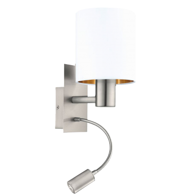 Een trendy wandlamp uit de textiellampen collectie van Eglo. De kap van de Pasteri is gemaakt van textiel en heeft de kleuren wit en koper. De behuizing van de lamp is nikkel-mat en is gemaakt van staal. De lamp heeft een E27-fitting en wordt exclusief lichtbron geleverd. De lamp is geschikt voor een max. wattage van 1x 40W. Verder komt de lamp goed tot zijn recht in de hal of woonkamer. De lamp heeft een schakelaar. De lamp heeft ook een LED lampje van 2,4W aan de onderkant.