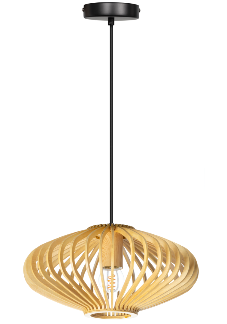 Een leuke hanglamp van ETH uit de Tess collectie. Deze houten hanglamp geeft door het ontwerp prachtig mooi licht af en een leuk effect door de open stukken tussen de houten balken. Past erg goed in een landelijk, Scandinavisch of modern interieur. De lamp wordt geleverd zonder lichtbron en heeft een E27 fitting geschikt voor max. 15W. Zo kan je zelf kiezen voor de gewenste lichtopbrengst en vorm lichtbron.