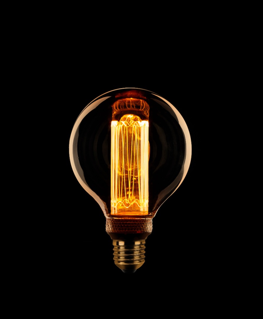 Een ledlamp uit de ETH collectie. Deze globelamp heeft een diameter van 8 cm en mag door zijn uiterlijk zeker gezien worden en is daarom erg leuk in open armaturen. De lamp heeft een prachtig goud getint glas en een verticale kooldraad spiraal en geeft hierdoor mooi zeer warm wit licht af. De lamp heeft een vermogen van 3,5W en is dimbaar.