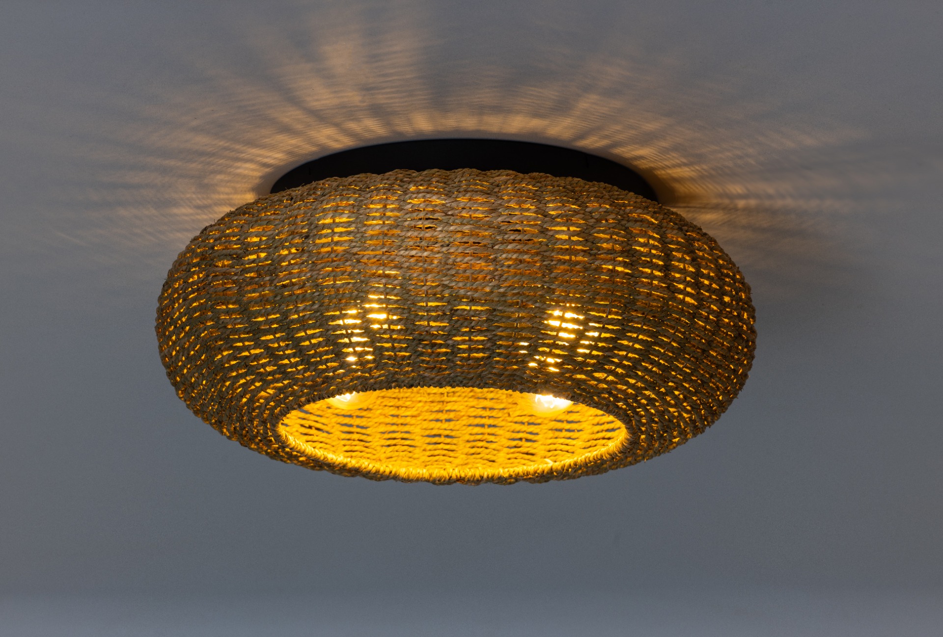 Een heel gave plafondlamp van ETH. De Nina is gemaakt van touw en geeft hierdoor een leuk landelijk tintje. De lamp is in 2 maten beschikbaar en het betreft hier de grotere variant met een diameter van 50 cm. Er zitten 4x E27 fitting in geschikt voor lichtbronnen van ieder max. 15W. De lichtbronnen worden niet meegeleverd dus je kan zelf de gewenste lichtopbrengst kiezen maar ook of je bijvoorbeeld een heldere lamp wil of juist met een gouden tintje. Alles kan om zo toch nog een eigen draai aan de lamp te geven!