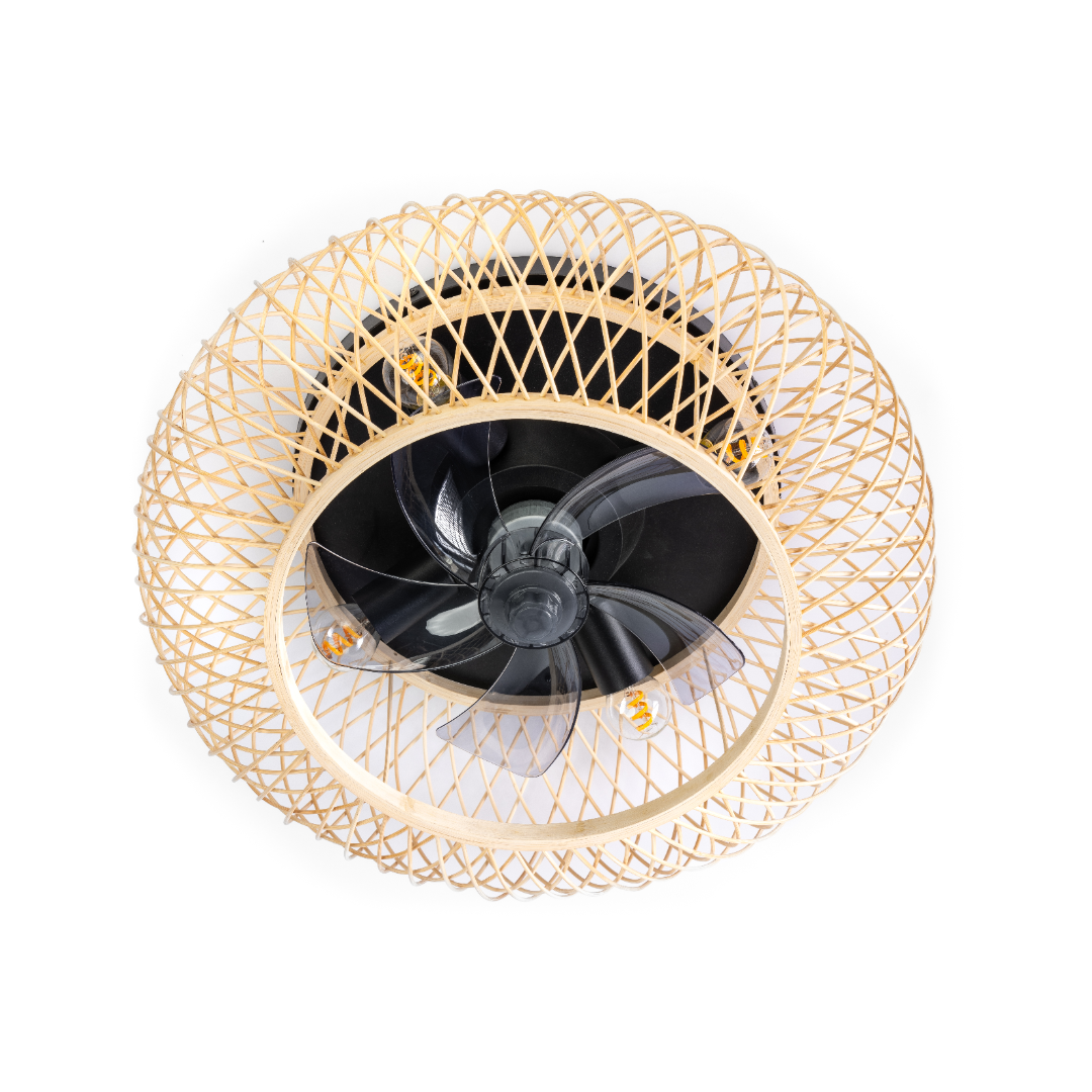 Een prachtige plafondventilator van ETH die ook nog eens leuk voor het oog is! Het bamboo design geeft deze lamp een landelijk tintje en zorgt ervoor dat de bladen niet zo opvallen. Het fijne aan deze ventilatorlamp is dat hij zowel een zomer- als winterstand heeft. Met de meegeleverde afstandbediening bedien je de ventilatorlamp heel eenvoudig en kan je de ventilator in 3 verschillende snelheden instellen maar ook timers en het licht aan en uit doen. Er zitten 4 E27 fittingen in de lamp, geschikt voor ieder max. 15W.
