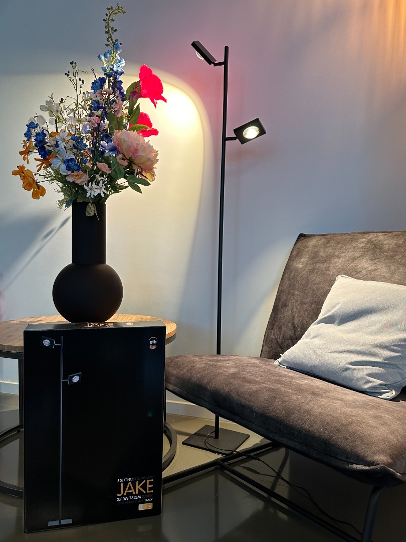 Een moderne vloerlamp van ETH. De vloerlamp heeft twee geïntegreerde ledmodule van 10W met ieder 782 lumen en een warme lichtkleur van 2700K. Bovendien is de lamp ook nog eens te dimmen in 3 standen door middel van de schakelaar op het snoer. De koppen van deze lamp (welke vrij richtbaar zijn) zijn uitgerust met een bol glas waardoor het licht mooi wordt verspreid en ook bijvoorbeeld goed geschikt is om dingen uit te lichten zoals een schilderij. Samen met de tafellamp uit dezelfde collectie maak je er één mooi geheel van.