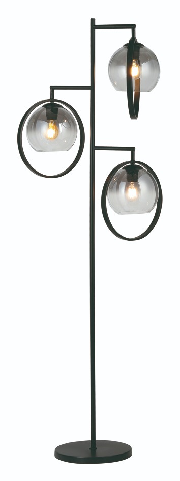 Een prachtig exemplaar binnen de Aureol serie is deze vloerlamp met 3 hangende lichtpunten. Het zwarte armatuur gecombineerd met het smoke glas zorgt ervoor dat de lamp zowel in een modern als industrieel interieur goed tot zijn recht komt. En door het bijzondere design zal de lamp zeker opvallen. Leuk om te combineren met alle andere lampen uit de Aureol serie. De ring heeft een diameter van 30 cm en het glas van 20 cm en de lamp wordt geleverd zonder lichtbron. Er zit 3x een E27 fitting in geschikt voor een lichtbron tot max. 25W. De lamp bedien je eenvoudig met de schakelaar op het snoer.