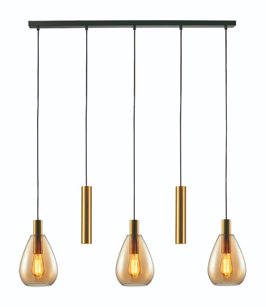 De Dorato serie van Freelight combineert een zwart armatuur met gouden details en amberkleurig glas. En deze hanglamp is nog eens extra chique door de combinatie van een pendel met glazen kap en een cilindervormige pendel. Hierdoor geeft de lamp een speels effect af. De glazen kappen hebben ieder een E27 fitting geschikt voor max. 25W en de 2 cilindervormige pendels hebben een GU10 fitting voor ieder een lichtbron van max. 25W. Je kan de pendels tijdens installatie op de gewenste hoogte instellen en zo leuke effecten creëren.