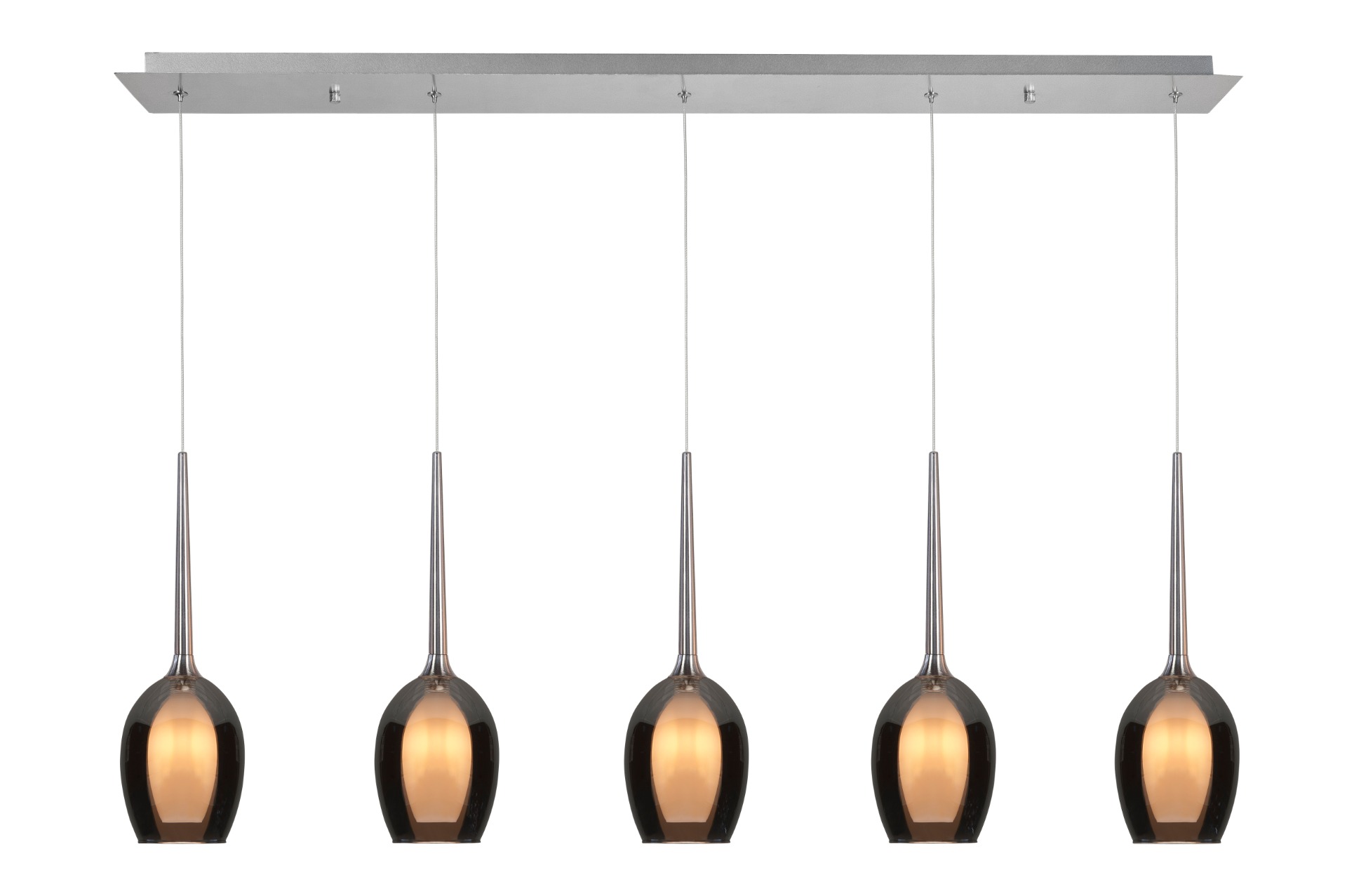 Een prachtige hanglamp uit de Belle collectie van Highlight. De mooie zwarte smoke kappen worden verrijkt door de opale kelk aan de binnenkant. Hierdoor verspreidt de lamp prachtig zacht licht. De 5 pendels zijn ieder apart te verstellen tijdens de installatie en hebben ieder een G9 fitting geschikt voor max. 4,5W. Indien je dimbare lichtbronnen erin plaatst en een externe dimmer hebt, kan je de lamp ook heel eenvoudig dimmen. Gezien de lengte van de lamp, is deze lamp uitermate geschikt om boven een kookeiland of eettafel te plaatsen.
