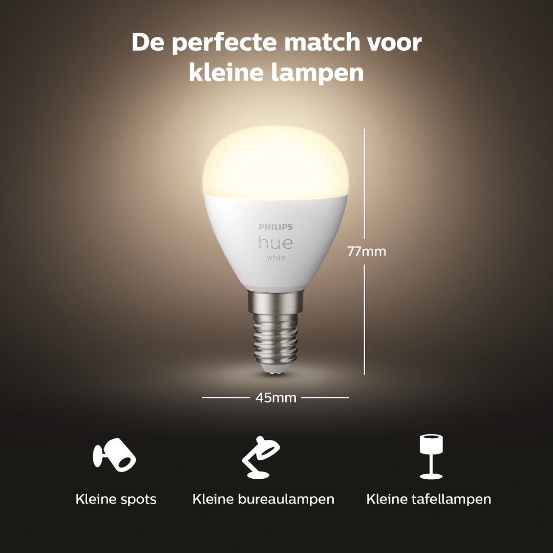 Met de slimme verlichting van Philips Hue kunt u alle kanten op! De kogellampjes zijn een stuk kleiner en zijn daardoor goed te gebruiken in kleinere armaturen (t.o.v. de E14 kaarslampen van Hue). De lampjes zijn gemakkelijk te installeren zonder gedoe en direct te gebruiken. De lamp beschikt over Bluetooth waardoor u de lamp gelijk kunt gebruiken en dimmen door middel van de app op uw telefoon of tablet. Wilt u nog meer slimme mogelijkheden? Voeg dan de Hue Bridge toe om gebruik te maken van de extra mogelijkheden.