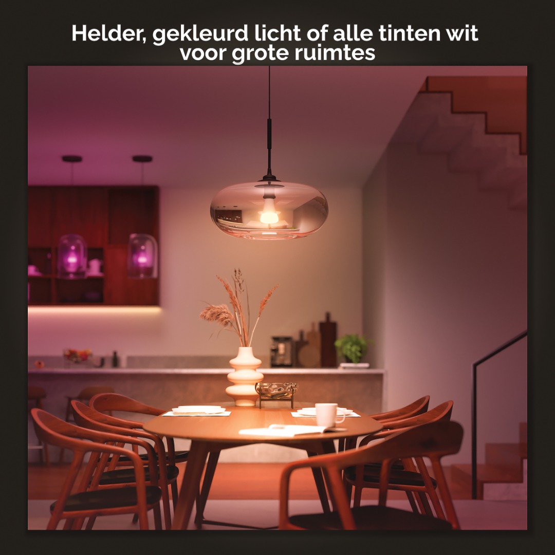 Met Philips Hue bepaal jij zelf welke sfeer je in huis wil hebben. Precies goed. Zonder kabels, een elektricien of installatiewerk, de lampen kunnen direct gedimd worden. Philips Hue biedt drie typen slimme lampen die in verschillende vormen, afmetingen en modellen worden geleverd. Kies Hue white voor eenvoudige bediening en comfort, Hue white ambiance voor ontspannend warmwit licht tot koel daglicht om je dagelijkse activiteiten te ondersteunen of Hue white and color ambiance voor een meeslepende ervaring. Ze werken allemaal samen om je woning slimmer, comfortabeler en energiezuiniger te maken.