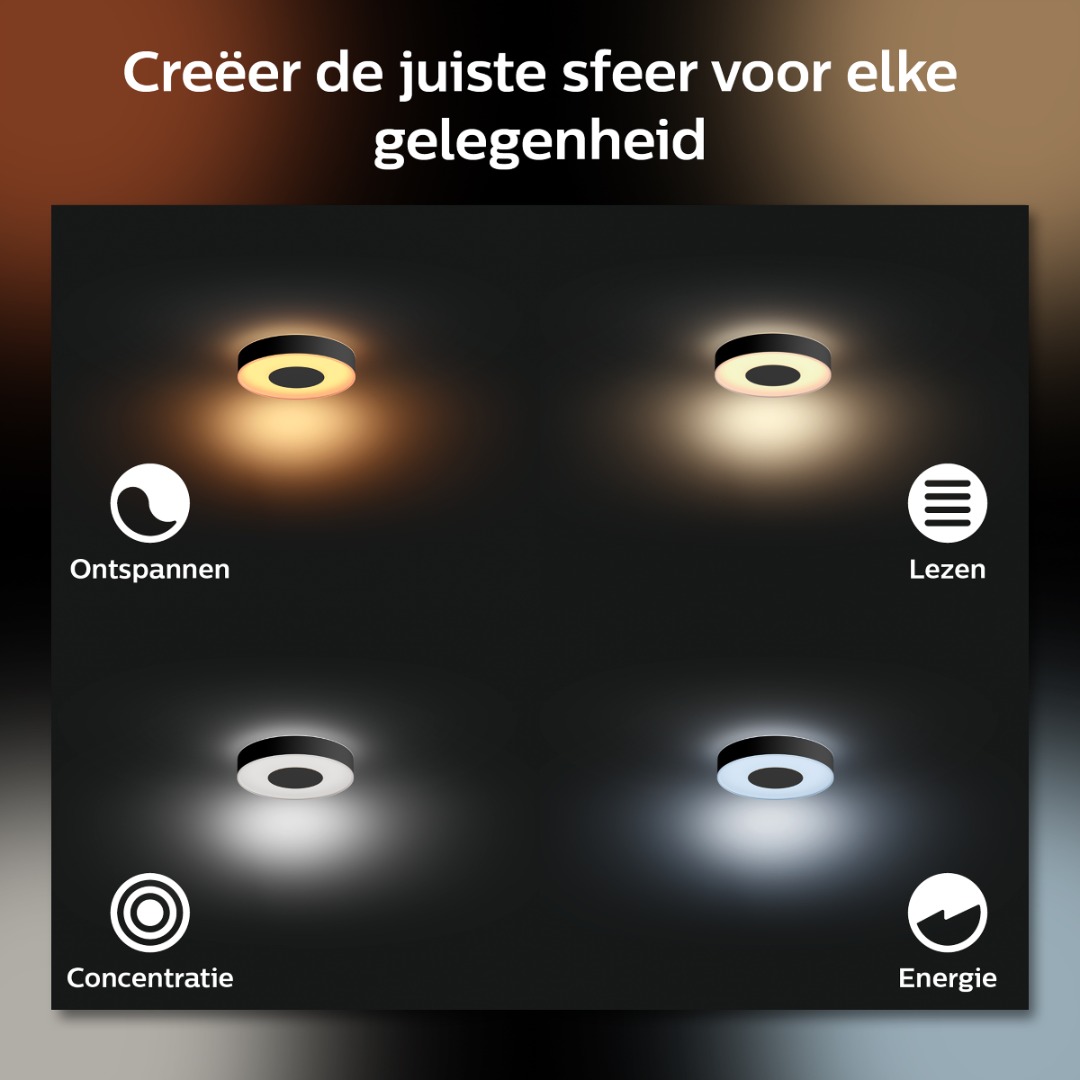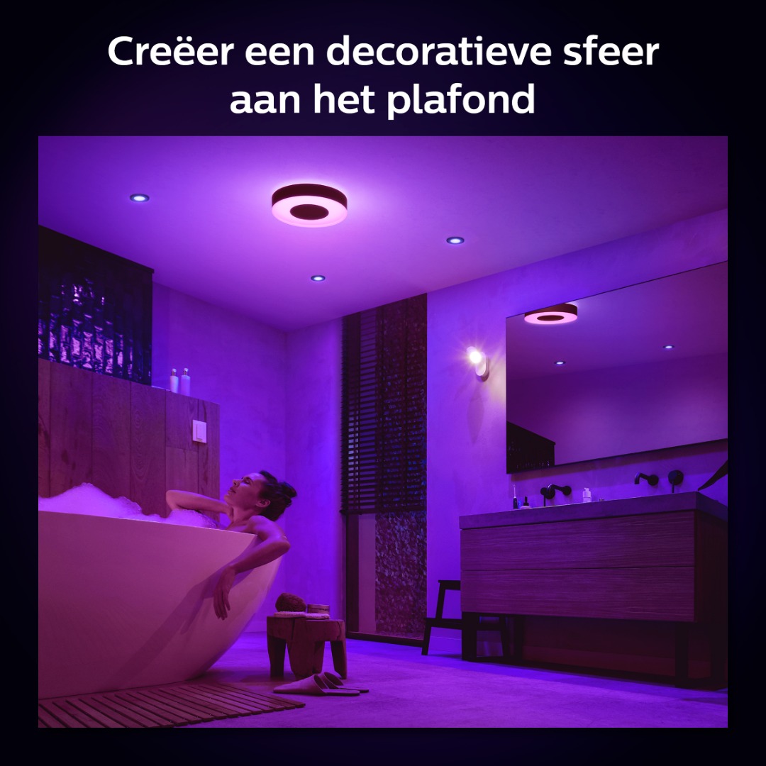 Breng je badkamer tot leven met deze plafondlamp uit de badkamer collectie van Philips Hue. De prachtige zwarte lamp past goed in een modern interieur en kan zowel 50.000 wittinten alsmede 16 miljoen kleuren schijnen. Maak van je tijd in de badkamer een echt feestje. Met een IP waarde van 44 is deze lamp waterbestendig en geschikt voor vochtige omgevingen. De lamp heeft een diameter van 38,1 cm en is hiermee de medium versie binnen de Xamento familie.
