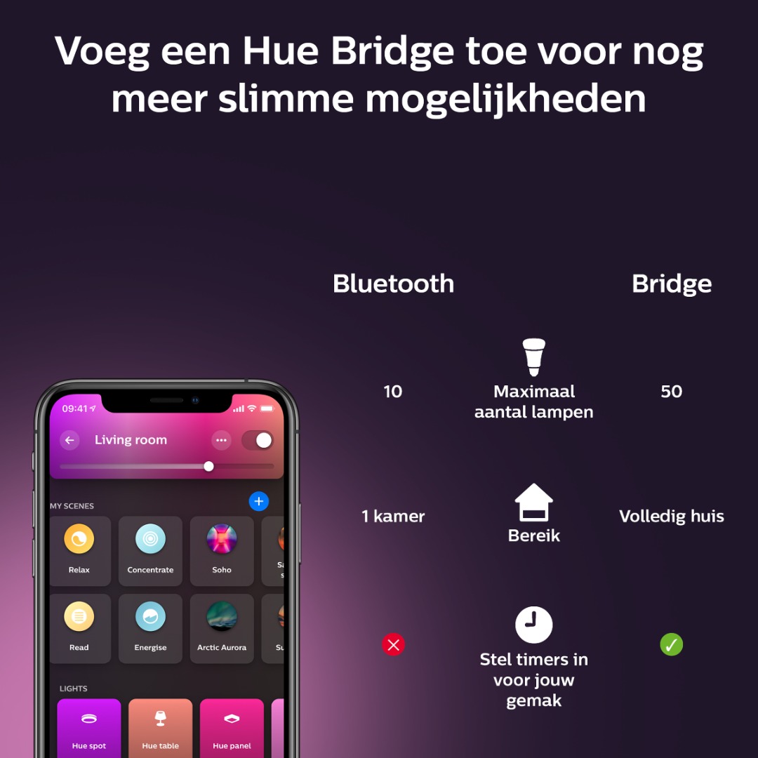 Met Philips Hue bepaal jij zelf welke sfeer je in huis wil hebben. Precies goed. Zonder kabels, een elektricien of installatiewerk, de lampen kunnen direct gedimd worden. Philips Hue biedt drie typen slimme lampen die in verschillende vormen, afmetingen en modellen worden geleverd. Kies Hue white voor eenvoudige bediening en comfort, Hue white ambiance voor ontspannend warmwit licht tot koel daglicht om je dagelijkse activiteiten te ondersteunen of Hue white and color ambiance voor een meeslepende ervaring. Ze werken allemaal samen om je woning slimmer, comfortabeler en energiezuiniger te maken.