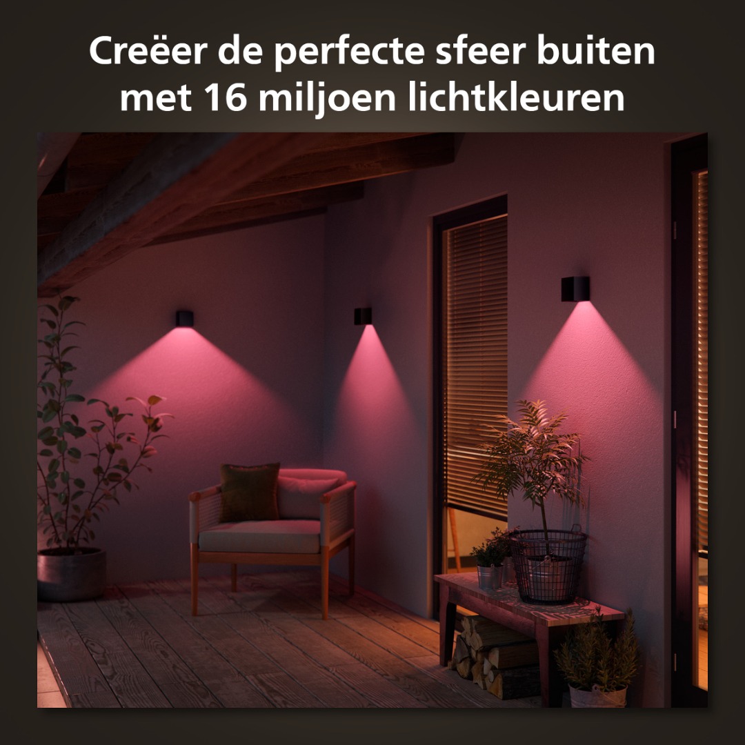 Het gaat hier om de downlight welke het licht enkel naar beneden schijnt. De up- & downlight van Philips Hue kunt u hier vinden. Een simplistische, maar daarom niet minder mooie, wandlamp uit de buitencollectie van Philips Hue. Met de meegeleverde klem kun je de lichtbundel verkleinen en bepaal je zelf de vorm van het licht. Deze wandlamp beschikt over Hue Wit en Gekleurd licht waarmee u kunt kiezen uit de 50.000 wittinten, alsmede de 16 miljoen kleuren. Hiermee kiest u de juiste kleur voor de juiste sfeer. Verbind de lamp met een Hue Bridge (niet inbegrepen) om gebruik te maken van alle extra opties die Hue biedt, zoals geofencing en bediening van buiten huis, en om de lamp met uw telefoon of tablet te kunnen bedienen. De lamp heeft een waarde van IP44, dus is spatwaterdicht en goed buiten te plaatsen.