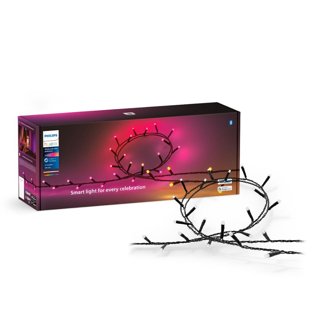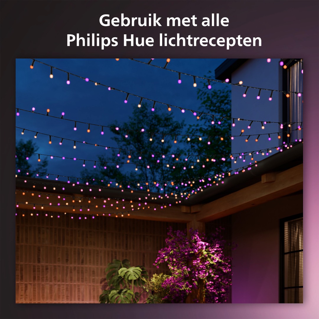 Laat het feest maar beginnen! Met de Philips Hue Festavia wordt dat gegarandeerd een succes. Hang het Festavia lichtsnoer rond een boom, boven je veranda of tuin maar ook je kerstboom geeft je een nieuwe dimensie met deze schitterende lampen. Doordat het snoer een IP waarde van 54 heeft, is deze geschikt voor zowel binnen- als buitengebruik. Zo geef je iedere dag een magisch tintje. Je kan het snoer een mooie gekleurde lichtgloed geven over de slinger of juist een prachtige warme wittint. Alles kan! In combinatie met de Hue Bridge (niet inbegrepen) maar je gebruik van alle mogelijkheden die Hue heeft te bieden zoals stembediening, geofencing en timers. Deze kabel is 40 meter lang en heeft in totaal 500 slimme, gekleurde LED's. Het snoer wordt geleverd inclusief voedingsbron met omvormer. En omdat het snoer op laagspanning werkt, kan je deze ook combineren met je reeds bestaande Hue buitenverlichting.