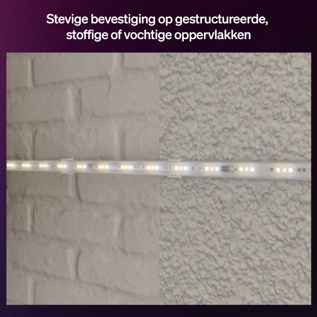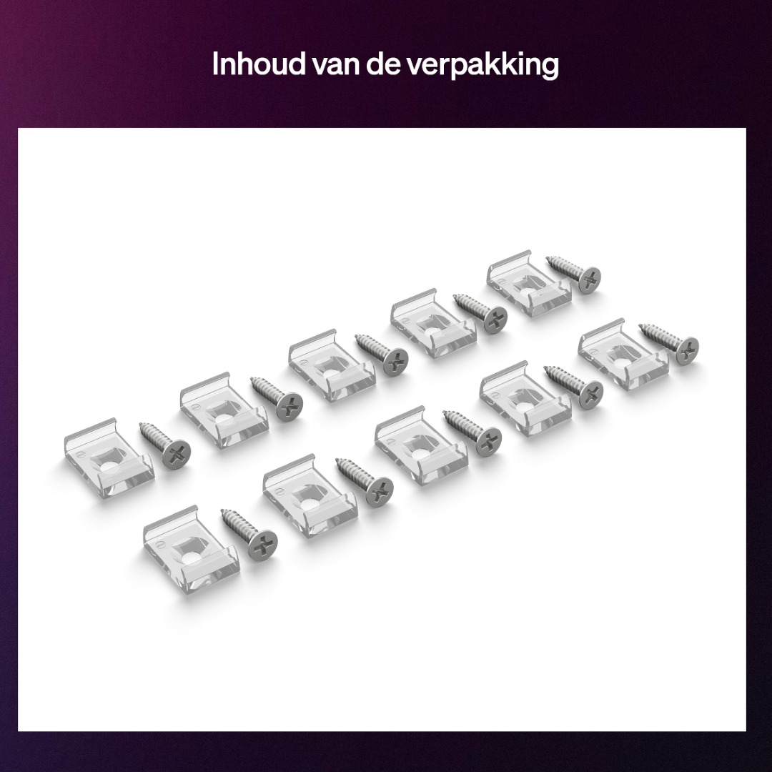 Met deze montagebeugels van Philips Hue kan je de Flux ledstrip eenvoudig monteren op bijvoorbeeld gestucte of oppervlakten waar de plakstrip niet goed werkt. Ook als je de strip wil verplaatsen en de plakstrip niet goed meer werkt of voor extra stevigheid kanj e deze montagebeugels gebruiken. Je kan de beugels zowel schroeven als plakken. In één verpakking zitten 10 montagebeugels.