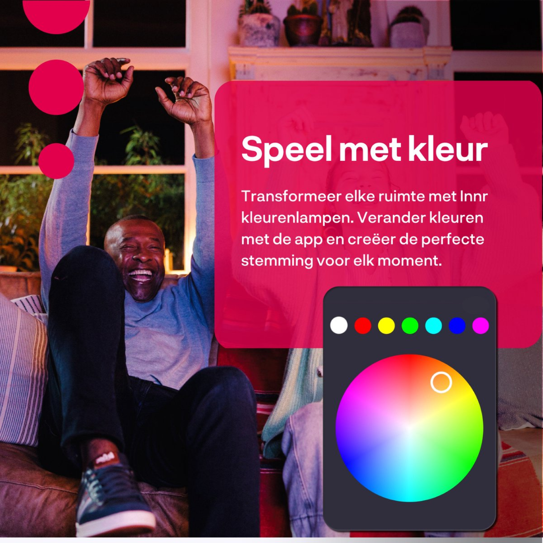 Met Innr creëer je de juiste sfeer voor het juiste moment. Door de slimme lampen, welke te bedienen zijn door middel van app op uw smartphone of tablet, kunt u eenvoudig de lampen dimmen en van kleur veranderen. Innr heeft diverse kleuren lampen met verschillende fittingen, zo kunt u uw verlichting in uw huis slimmer maken. Zo kunt u alle lampen aan-/ en uitzetten maar ook van kleur veranderen om diverse scènes te creëren. Van fel licht voor als u zich moet concentreren tot aan warm sfeerlicht voor een gezellige avond met vrienden, met Innr is alles mogelijk!