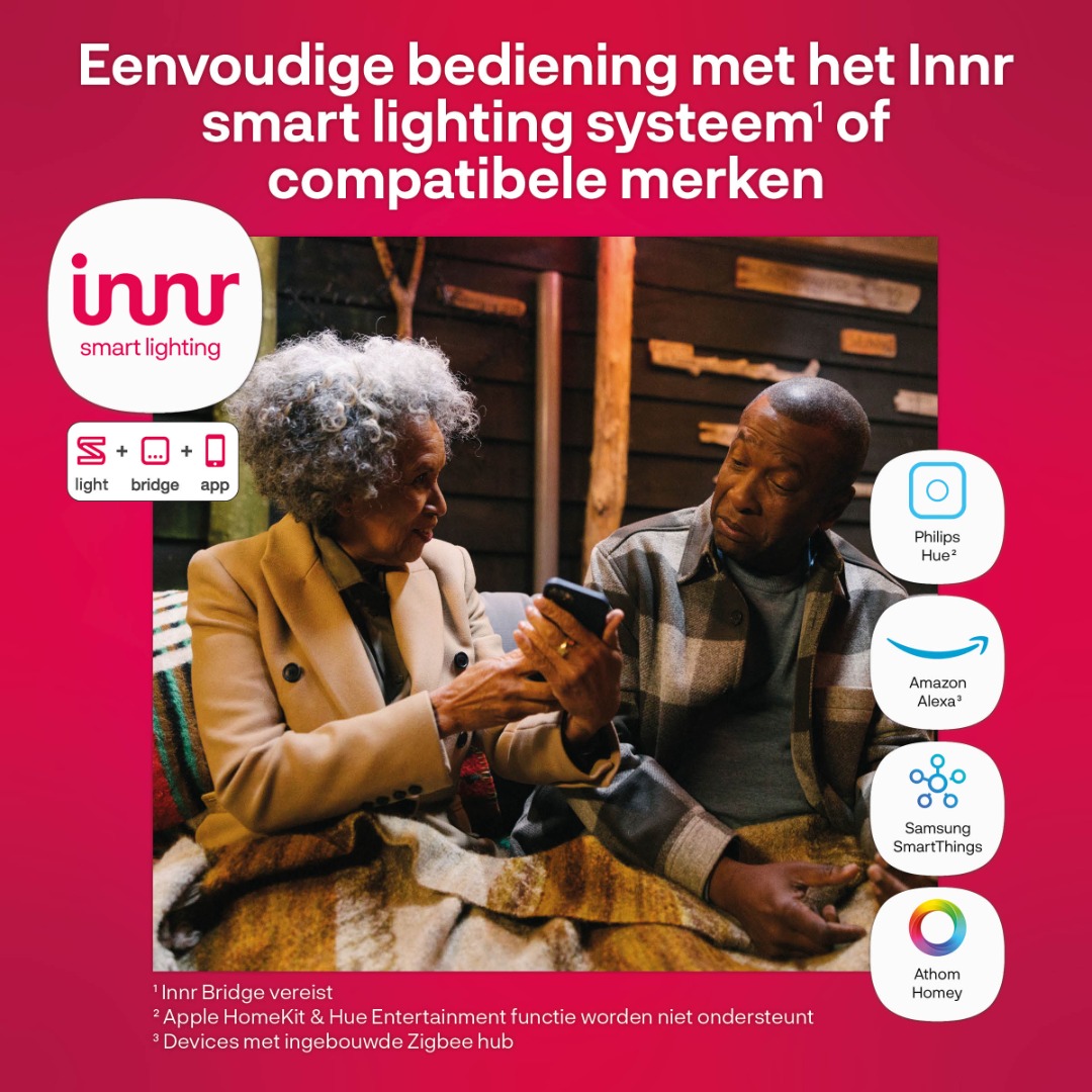 Met Innr creëer je de juiste sfeer voor het juiste moment. Door de slimme lampen, welke te bedienen zijn door middel van app op uw smartphone of tablet, kunt u eenvoudig de lampen dimmen en van kleur veranderen. Innr heeft diverse kleuren lampen met verschillende fittingen, zo kunt u uw verlichting in uw huis slimmer maken. Zo kunt u alle lampen aan-/ en uitzetten maar ook van kleur veranderen om diverse scènes te creëren. Van fel licht voor als u zich moet concentreren tot aan warm sfeerlicht voor een gezellige avond met vrienden, met Innr is alles mogelijk!
