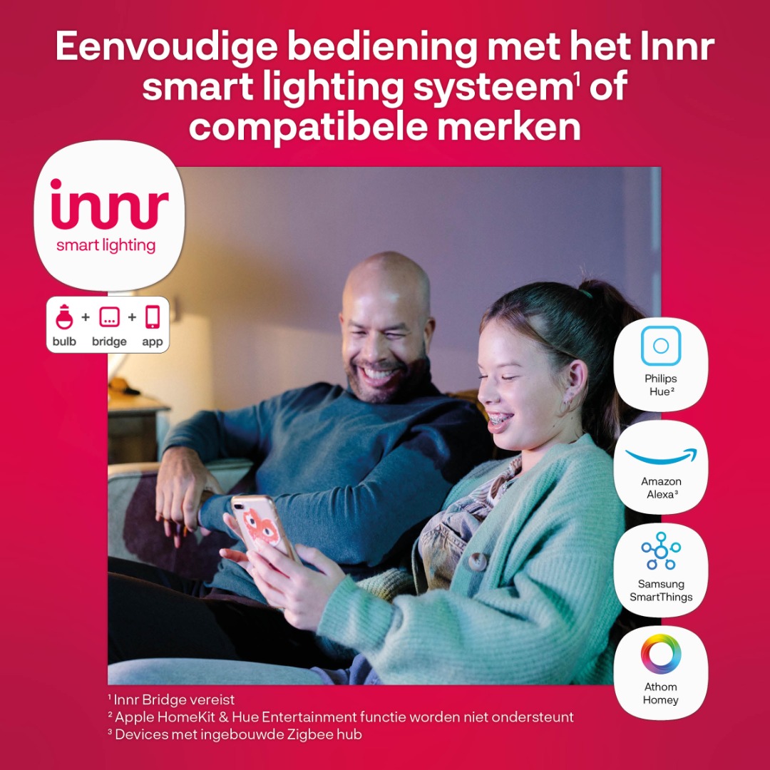 Met Innr creëer je de juiste sfeer voor het juiste moment. Door de slimme lampen, welke te bedienen zijn door middel van app op uw smartphone of tablet, kunt u eenvoudig de lampen dimmen en van kleur veranderen. Innr heeft diverse kleuren lampen met verschillende fittingen, zo kunt u uw verlichting in uw huis slimmer maken. Zo kunt u alle lampen aan-/ en uitzetten maar ook van kleur veranderen om diverse scènes te creëren. Van fel licht voor als u zich moet concentreren tot aan warm sfeerlicht voor een gezellige avond met vrienden, met Innr is alles mogelijk!