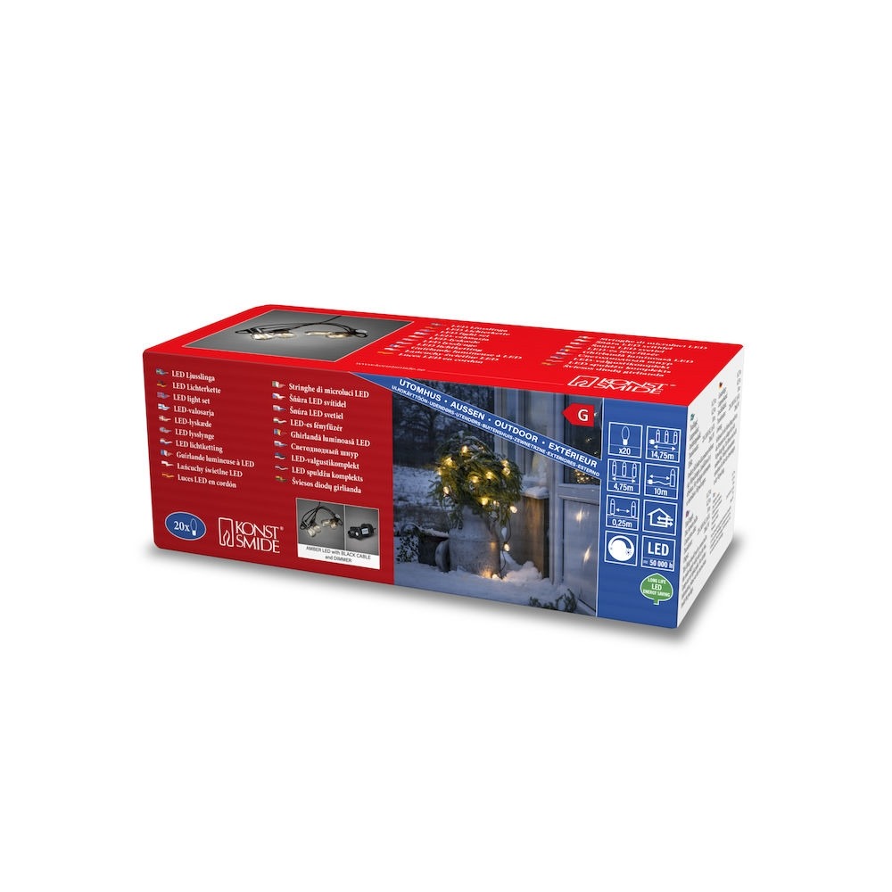 Kom maar op met die leuke zomeravonden en feestjes! Maak je tuin extra feestelijk door deze lichtslinger met leuke kleine peertjes. Het lichtsnoer zelf heeft een lengte van 4,75 meter en de lampen zitten op 25 centimeter afstand van elkaar af. De lengte vanaf de eerste lamp tot de trafo is 10 meter, wat op een totaal komt van 14,75 m. Totaal heeft het lichtsnoer 20 lampen. Het betreft LED lampen welke zuinig zijn en mooi warm wit licht afgeven. Bovendien zit er een zwarte kabel met transformator op de lampen en ingebouwde dimmer! Zo kunt u het licht dus ook nog naar wens aanpassen. De lichtsnoeren van Konstsmide werken op 24V en worden geleverd met transformator erbij.