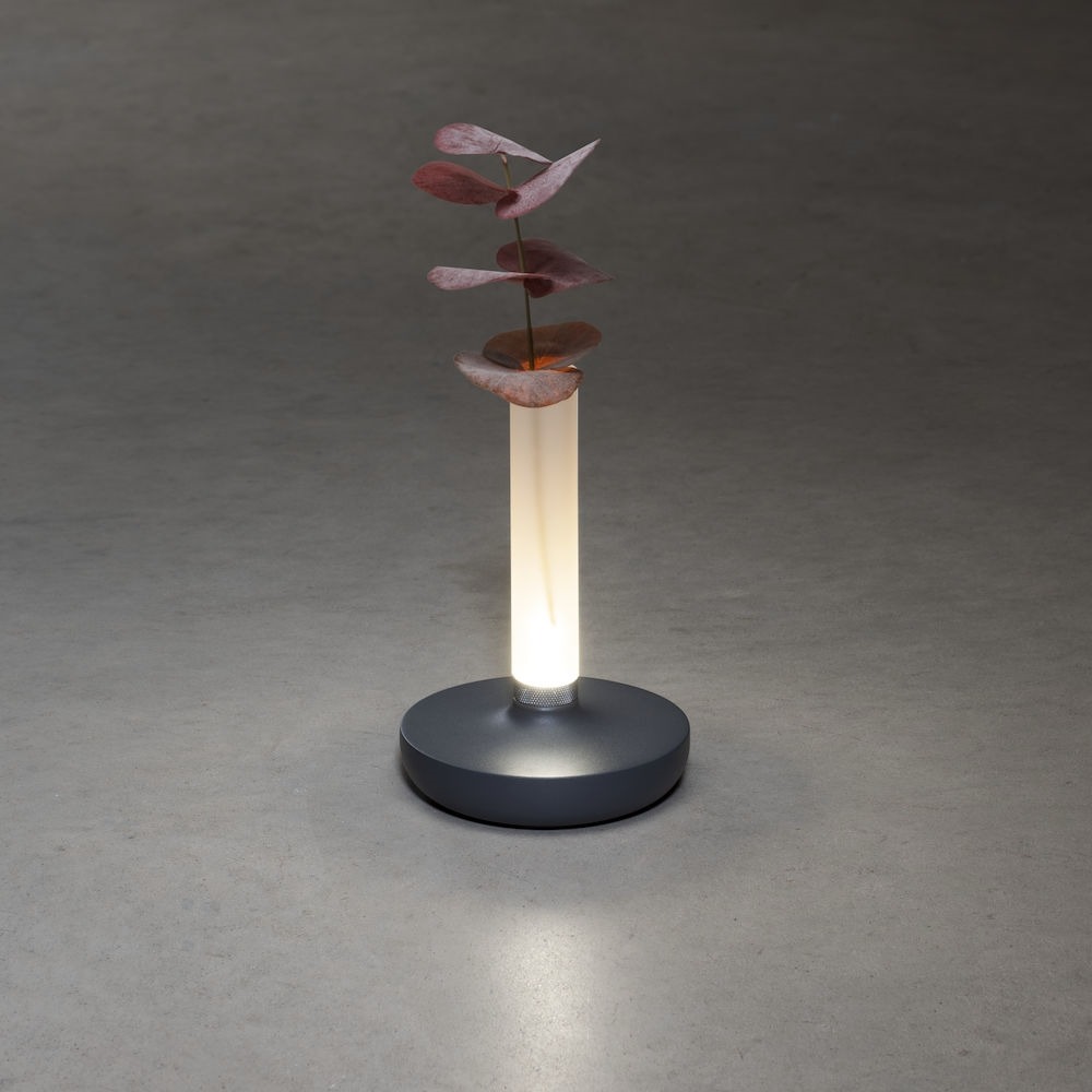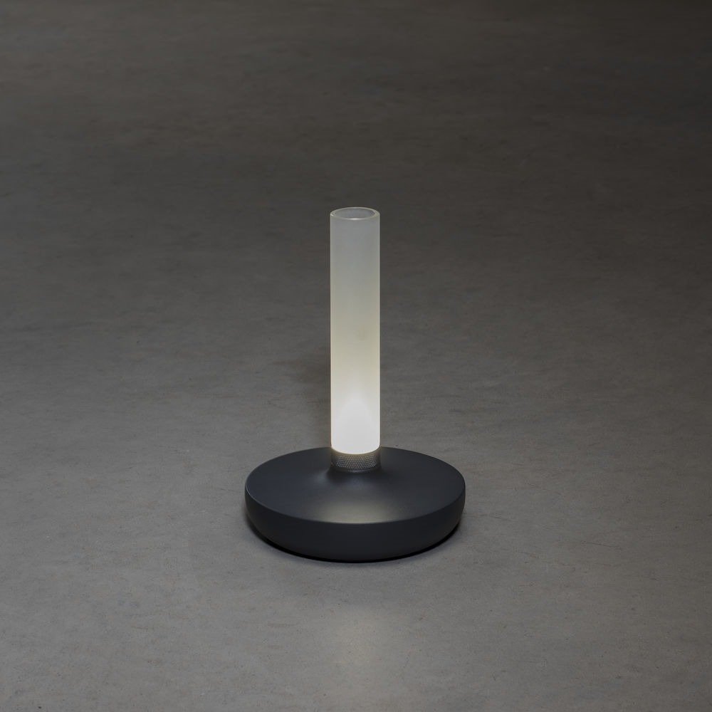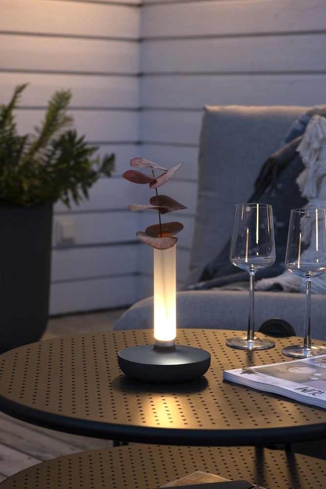 Leuk je buitentafel op met deze Biarritz tafellamp van Konstsmide. De lamp is een soort kaarsvorm met het prachtige matte glas, waar je ook wat leuke (nep)bloemen in kan zetten. Zo decoreer en verlicht je je buitentafel in één keer. De lamp is draadloos en wordt geleverd inclusief laadkabel, welke 6 uur neemt tot volledig opgeladen. Er zitten veel functies op de lamp, waaronder dat je de lichtkleur kunt wijzigen van 1800K naar 3000K en ook nog naar 4000K. Warmer licht als je wat meer sfeer wil of juist iets koeler licht als je wat meer licht nodig hebt. Bovendien kan je binnen de 3 lichtkleuren het licht ook nog eens dimmen met de dimmer onderaan de lange staaf, door simpelweg deze ring te draaien.