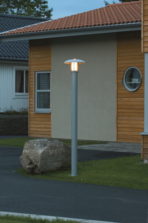 Een moderne lantaarnpaal van Konstsmide. De lamp is gemaakt van aluminium en heeft een grijze kleur. Deze lamp wordt geleverd exclusief lichtbron, geschikt voor max. 60W met een E27 fitting. De lamp staat mooi in de buitenomgeving, bijvoorbeeld tuin of langs een tuinpad.