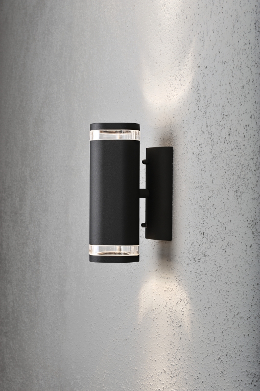 Een moderne wandlamp van Konstsmide. De lamp is gemaakt van aluminium en heeft een zwarte kleur. De lamp schijn zowel licht naar boven als beneden en door de 2 doorzichtige ringen die er tussen zitten, geeft dit een leuk effect. De lichtbronnen zijn niet meegeleverd en de lamp heeft 2x GU10 fittingen, ieder geschikt voor een max. wattage van 35W.