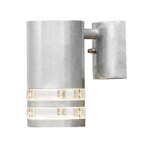 Een moderne wandlamp van Konstsmide. De lamp is gemaakt van aluminium en heeft een gegavaniseerd stalen kleur. De lamp schijnt licht naar beneden en door de 2 doorzichtige ringen die er tussen zitten, geeft dit een leuk effect. De lichtbron is niet meegeleverd en de lamp heeft een GU10 fitting, geschikt voor een max. wattage van 35W.