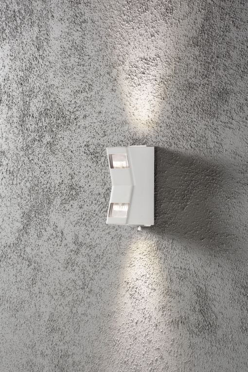 Een moderne wandlamp van Konstsmide. De lamp is gemaakt van aluminium en heeft een geheel witte kleur. Deze lamp wordt geleverd exclusief lichtbron, geschikt voor max. 2x 6W met een GU10-LED fitting. De lamp kan bijvoorbeeld goed geplaatst worden naast een deur.