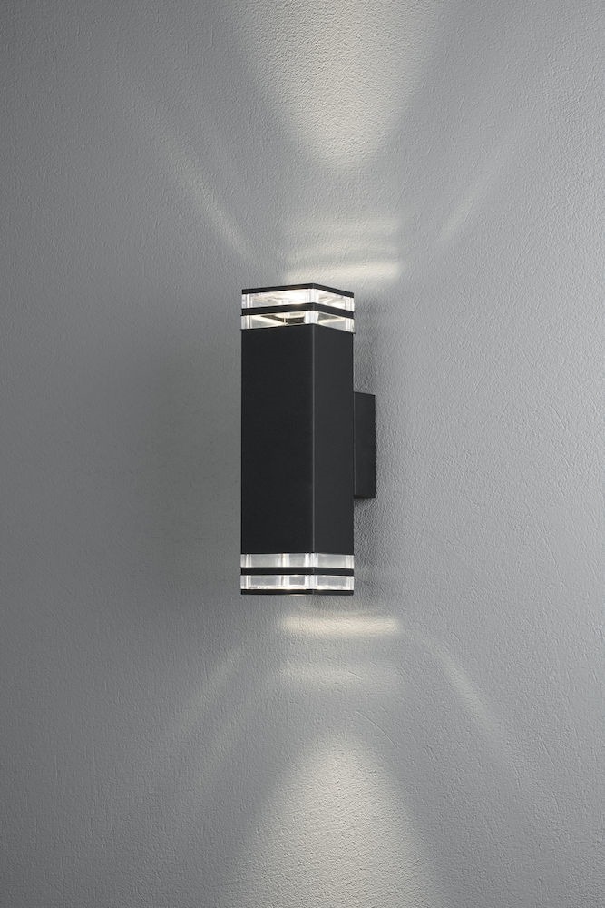 Een moderne wandlamp van Konstsmide. Deze aluminium lamp heeft een mooie zwarte kleur met een rechthoekige behuizing. De Pollux kan je prachtig aan een van uw buitenmuren bevestigen. De lamp heeft boven en onder een doorzichtig gedeelte van 2 ringen en geeft hierdoor erg leuk licht. Wordt geleverd zonder lichtbronnen en heeft 2x GU10 fittingen, ieder geschikt voor max. 7W.
