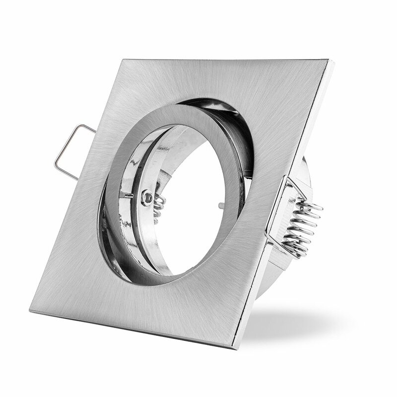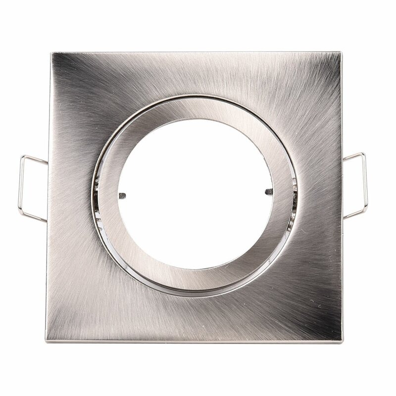 Een moderne vierkante inbouwspot de kleur geborsteld ijzer met een zaagmaat van 6,8 cm. De spot is kantelbaar zodat je het licht zowel naar beneden als gericht kan laten schijnen en wordt afgesloten met een handige bajonetringsluiting. Standaard wordt de spot zonder fitting geleverd maar kan tegen meerprijs met zowel GU10 (230V) als GU5.3 (12V) worden geleverd. De spots hebben een IP waarde van 20 en zijn daarmee alleen geschikt voor droge ruimtes en niet voor bijv. de badkamer of buiten.