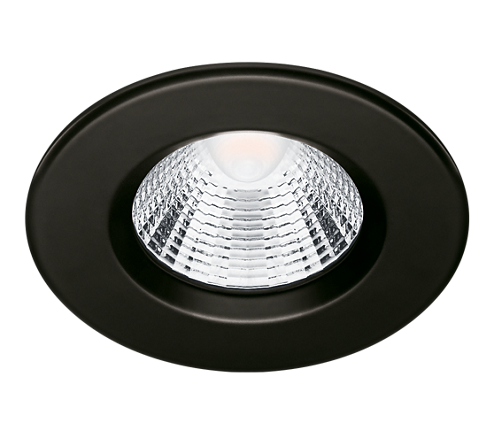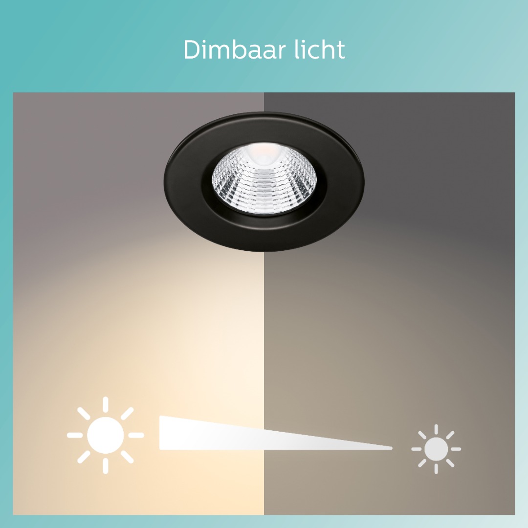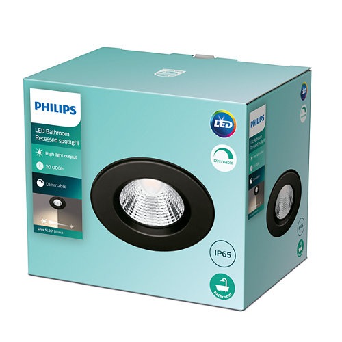 Moderne, zwarte inbouwspots, ideaal geschikt voor in de badkamer. De spots zijn dimbaar en beschikken over EyeComfort. Fijn licht voor de ogen! De inbouwspotjes bieden volgens hun IP65-classificatie bescherming tegen binnendringend vocht en zijn in de meeste standaard verlaagde plafonds te monteren, ook recht boven de douche of het bad.