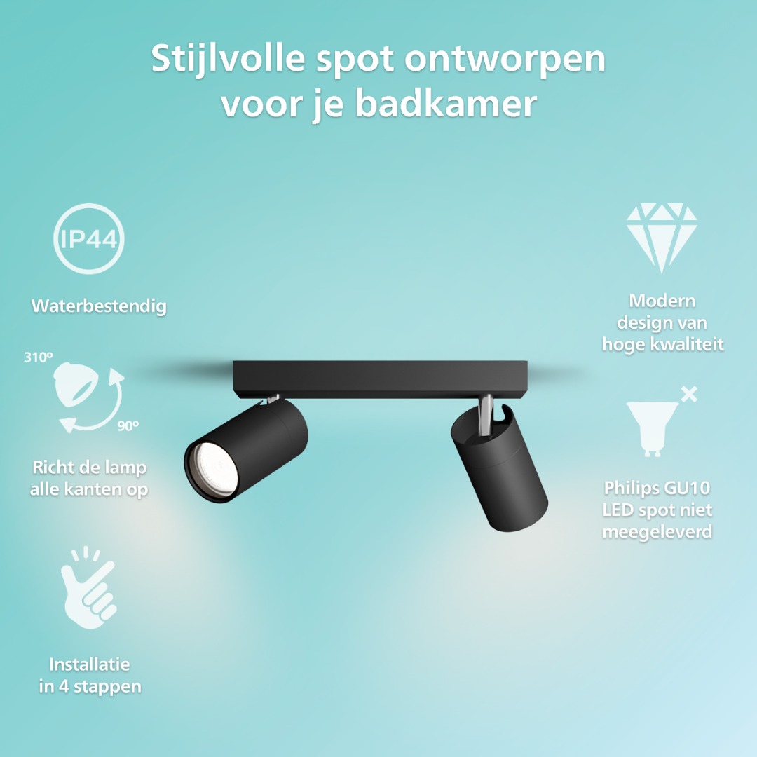 Een moderne opbouwspot uit de Philips collectie die door zijn IP-waarde van 44 geschikt om in de badkamer te plaatsen. Deze moderne spot past eigenlijk bijna wel in elke badkamer. De spot heeft 2x een GU10 fitting geschikt voor een lichtbron van ieder max. 5W. De spots kan je diverse kanten op richten, zo schijn je het licht precies daar waar je het hebben wil.