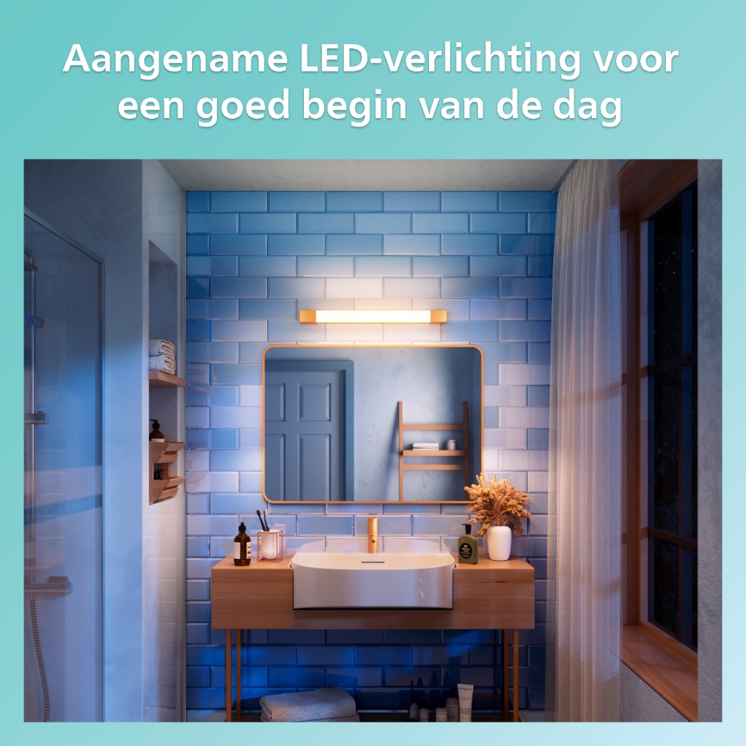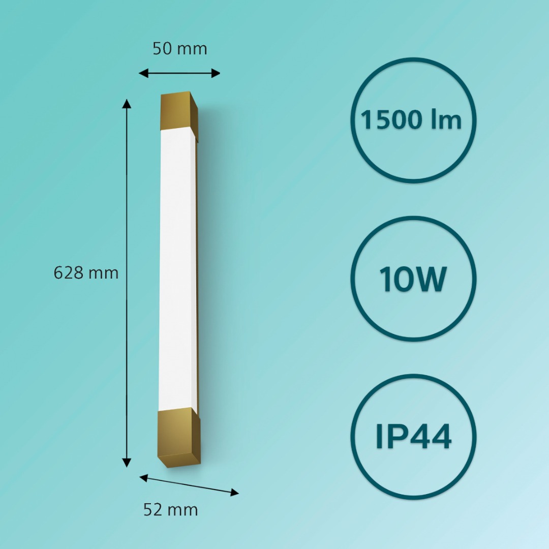 Deze langwerpige wandlamp van de Philips MyBathroom collectie is perfect geschikt voor spiegelverlichting. De lamp kan zowel horizonaal als verticaal worden gemonteerd en schijnt prachtig warm wit licht van 2700K. De lamp is niet dimbaar. Het armatuur van de lamp heeft een prachtige messing kleur. De lamp is veilig om in de badkamer te gebruiken door zijn IP44 waarde.