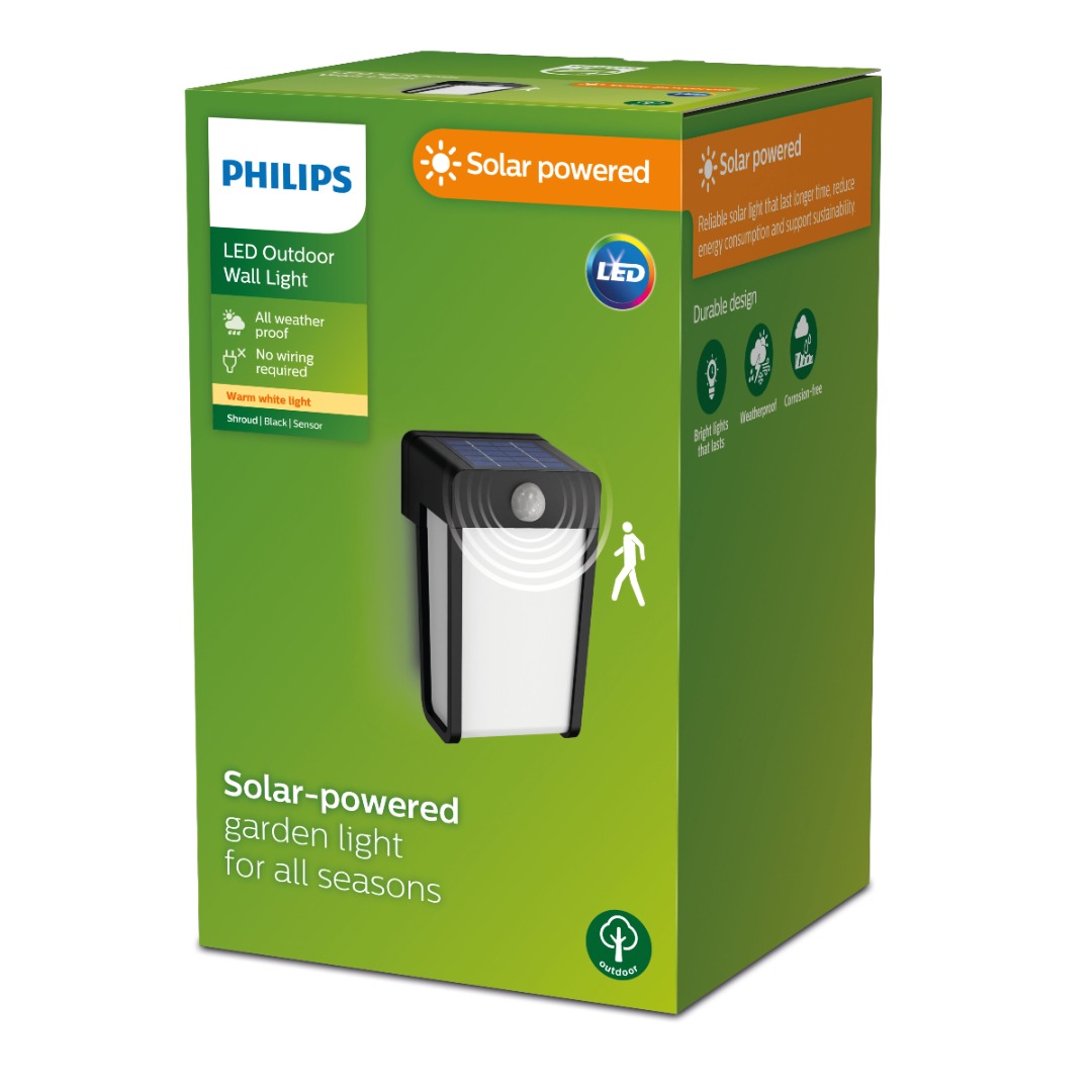Een mooie, moderne wandlamp van Philips MyGarden, speciaal geschikt voor buiten gebruik. Het zwarte ontwerp van deze Shroud wandlamp steekt prachtig af tegen de wand en de lamp heeft een mooi opaal glas waardoor het licht mooi zacht verspreid wordt. De lamp werkt op solar dus geen ingewikkeld installatie werk en handig voor als u geen stroompunt heeft. Simpelweg opladen door de zon en de lamp zijn werk laten doen. En of dat nog niet genoeg is heeft de lamp ook nog eens een bewegingssensor waardoor de lamp automatisch wordt ingeschakeld zodra deze beweging detecteert.