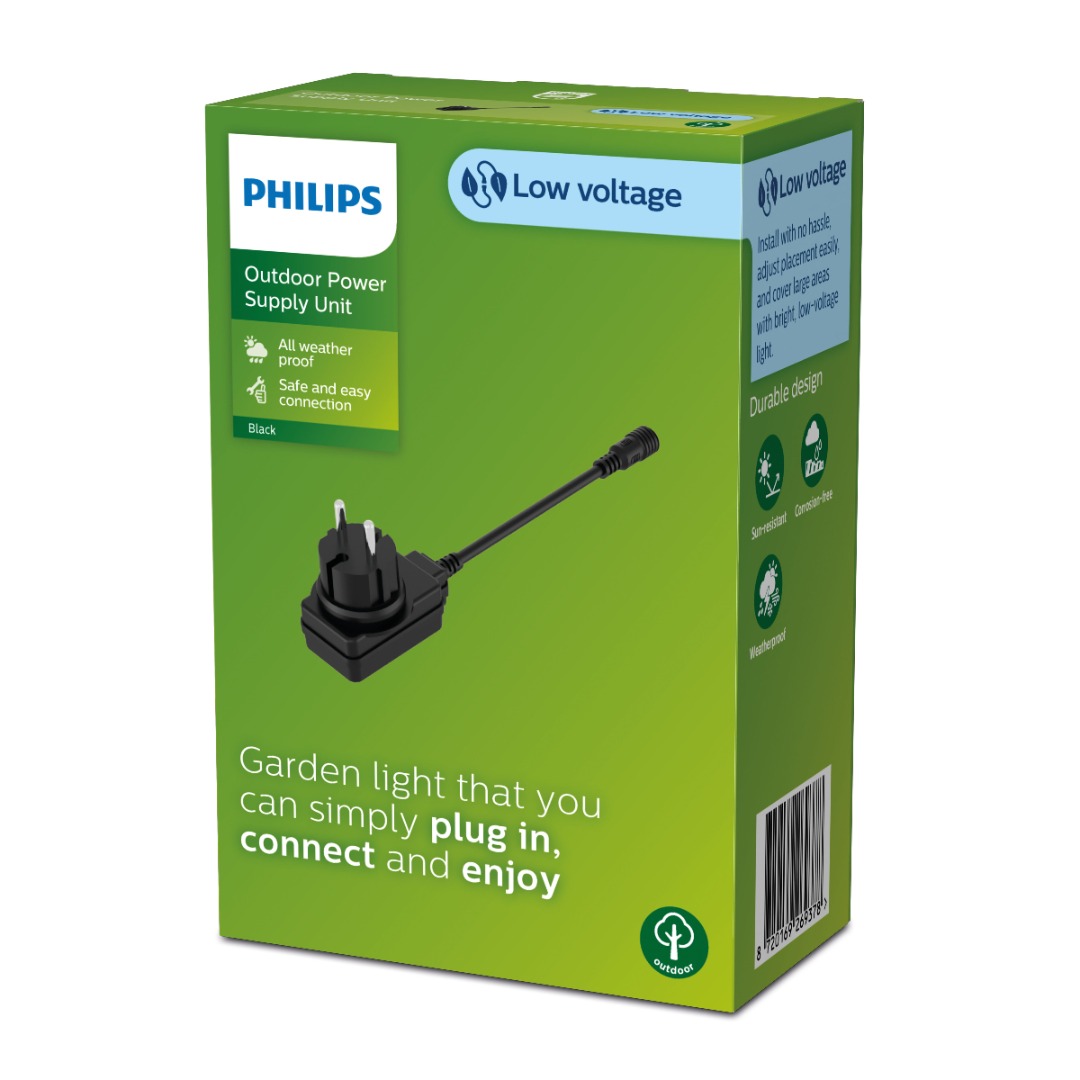 Deze voedingsunit is de start van je Philips Gardenlink systeem. Met deze unit kan je de lampen eenvoudig van stroom voorzien. Dankzij de 24V laagspanning hoef je geen stroomkabels in te graven, wat schors eroverheen en klaar!